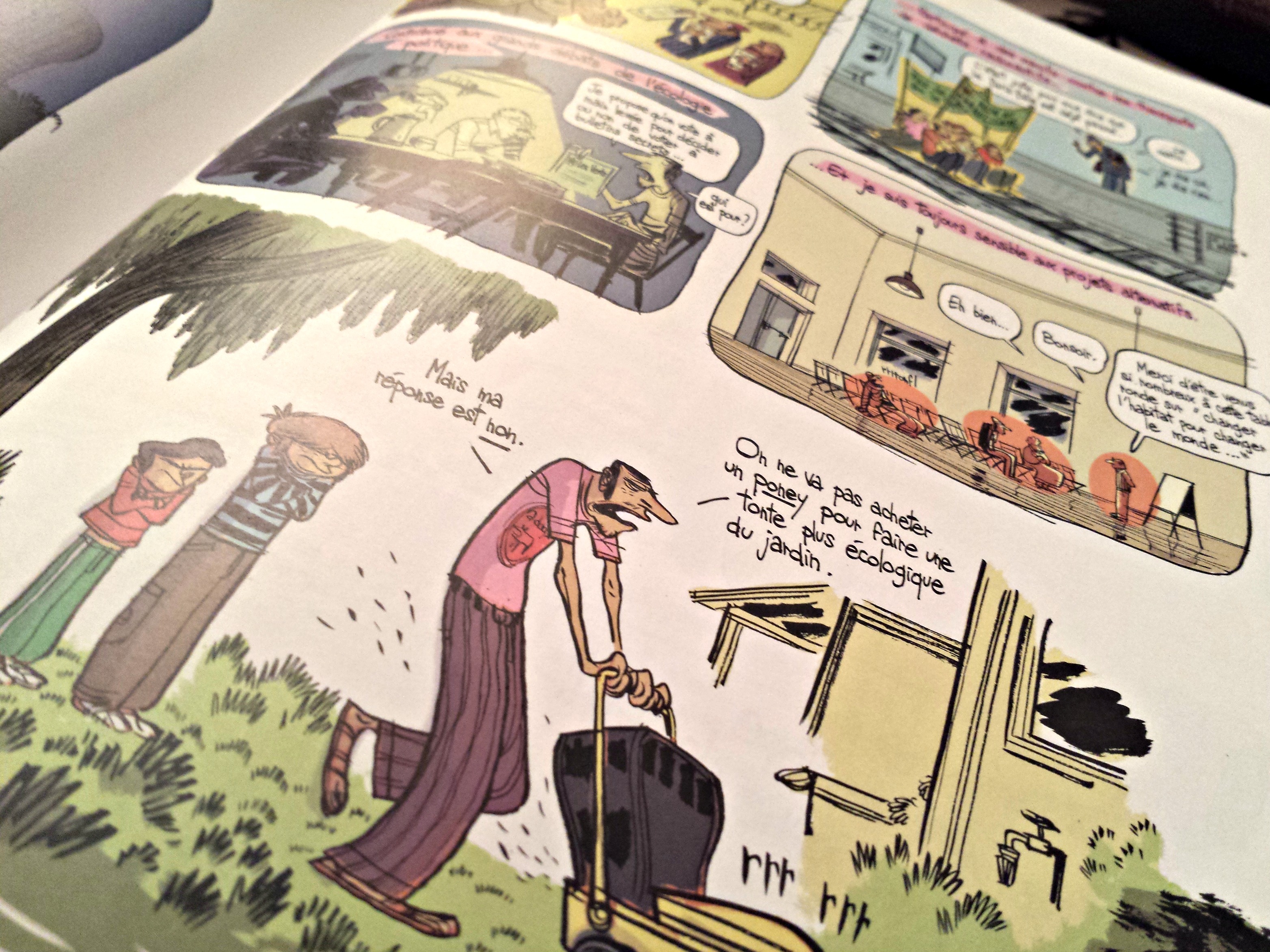 Autobio, c’est seulement (malheureusement) deux volumes compilant les aventures écologico-familiales de Cyril Pedrosa publiées chez Fluide Glacial. AMAP, vélo, tri sélectif, désherbage, éducation des enfants qui veulent une console, dilemme du départ en vacances en voiture/train/avion/vélo… tout ça sent le vécu à plein nez. Si Cyril Pedrosa est sincèrement engagé dans le combat écologique et les belles valeurs de partage d’une société collaborative, il n’en est pas moins totalement lucide sur les contradictions qui nous animent, nous les citadins. Nous les bobos ? Même sur ça il s’interroge. En est-il un ?