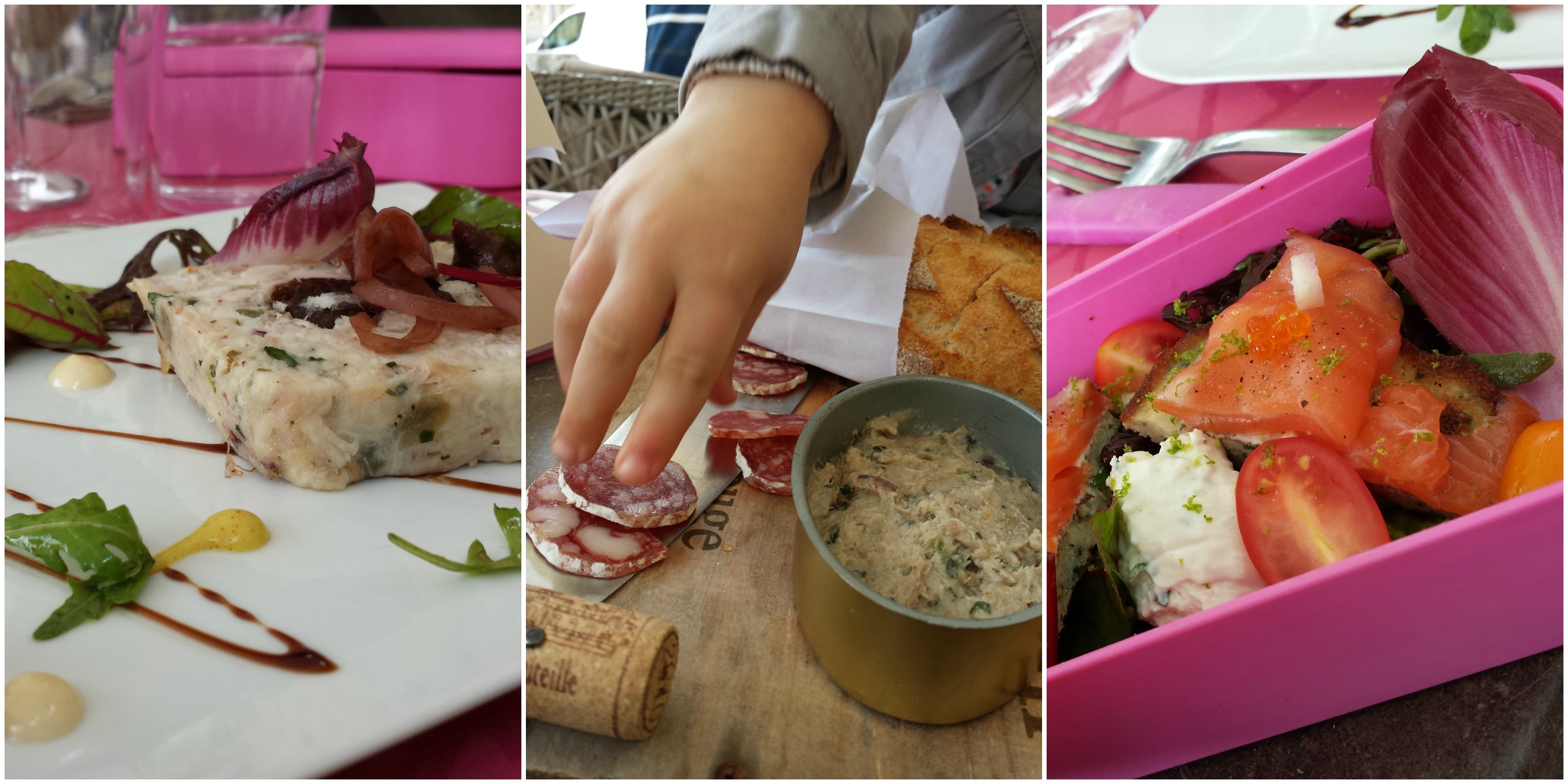 J’ai donc goûté tous les autres plats (sauf le baba, mais qui était apparemment très bon et qui a bénéficié d’une rasade de rhum supplémentaire sur demande). Je ne vais pas rentrer dans les détails mais tout était très bon. Notez que l’entrée au saumon était servie dans un bento Monbento ! Pas dépaysée du coup ! Comme je l’ai précisé dans mon précédent billet, le repas a été accompagné d’un vin local et bio de chez Yvan Bernard, un rouge léger et fruité qui s’est parfaitement accommodé de tous les plats.