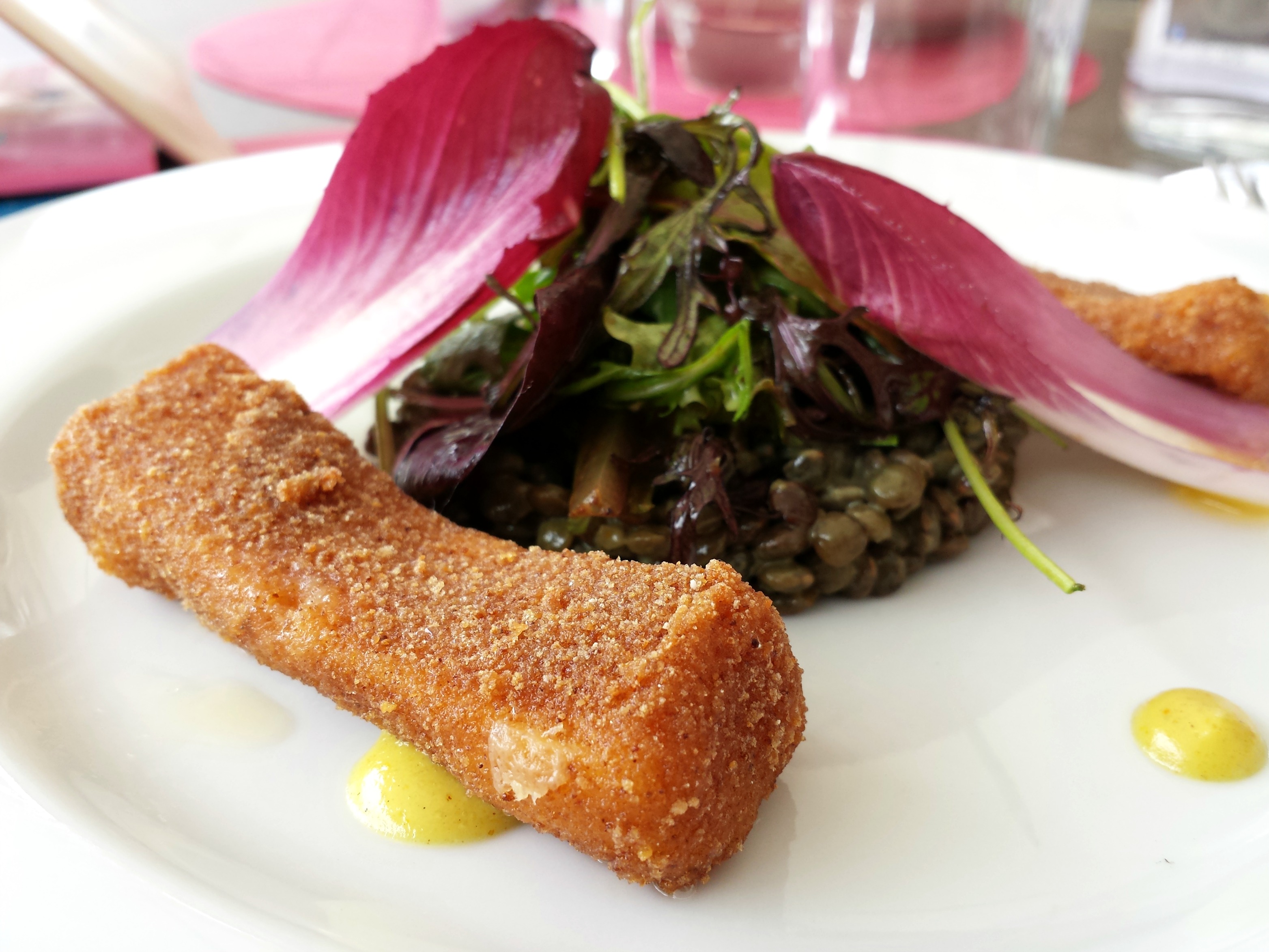 En entrée j’ai pris les frites de cantal avec le tartare de lentilles vertes du Puy. Ce qui distingue une grande table d’une autre c’est le souci du détail. Les petites taches jaunes dans l’assiette là, tu crois que c’est pour faire joli mais en fait c’est une sorte de petite moutarde qui relève à la perfection la frite de cantal. Les lentilles étaient parfaitement assaisonnées, craquantes juste ce qu’il faut.