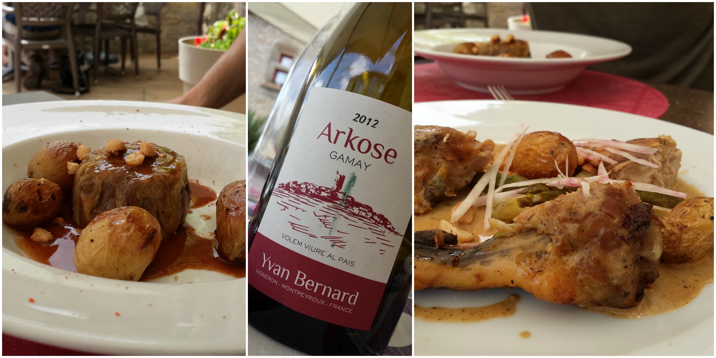 Le cadre ? Une salle bourrée de charme, comme un cocon avec ses alcôves voûtées et sa déco design aux couleurs chaleureuses (mes photos ne rendent pas justice à cet intérieur). Côté terrasse, une petite partie juste devant le restaurant, l’autre partagée un peu plus loin avec l’autre établissement de la place. Au pied du donjon, au milieu des façades d’arkose et de la vigne, l’ambiance y est charmante et ensoleillée. Le seul petit bémol est le mini-parking juste sous le nez des convives mais il faut bien que les autochtones rentrent chez eux. Pour rappel, les visiteurs sont invités à se garer en bas du village dans un parking prévu à cet effet. Je ne dirai rien au sujet des voisins du dessus très à cheval sur le cadastre et sur l’exclusivité de leur escalier… ah ben si tiens, je l’ai dit. Oups.