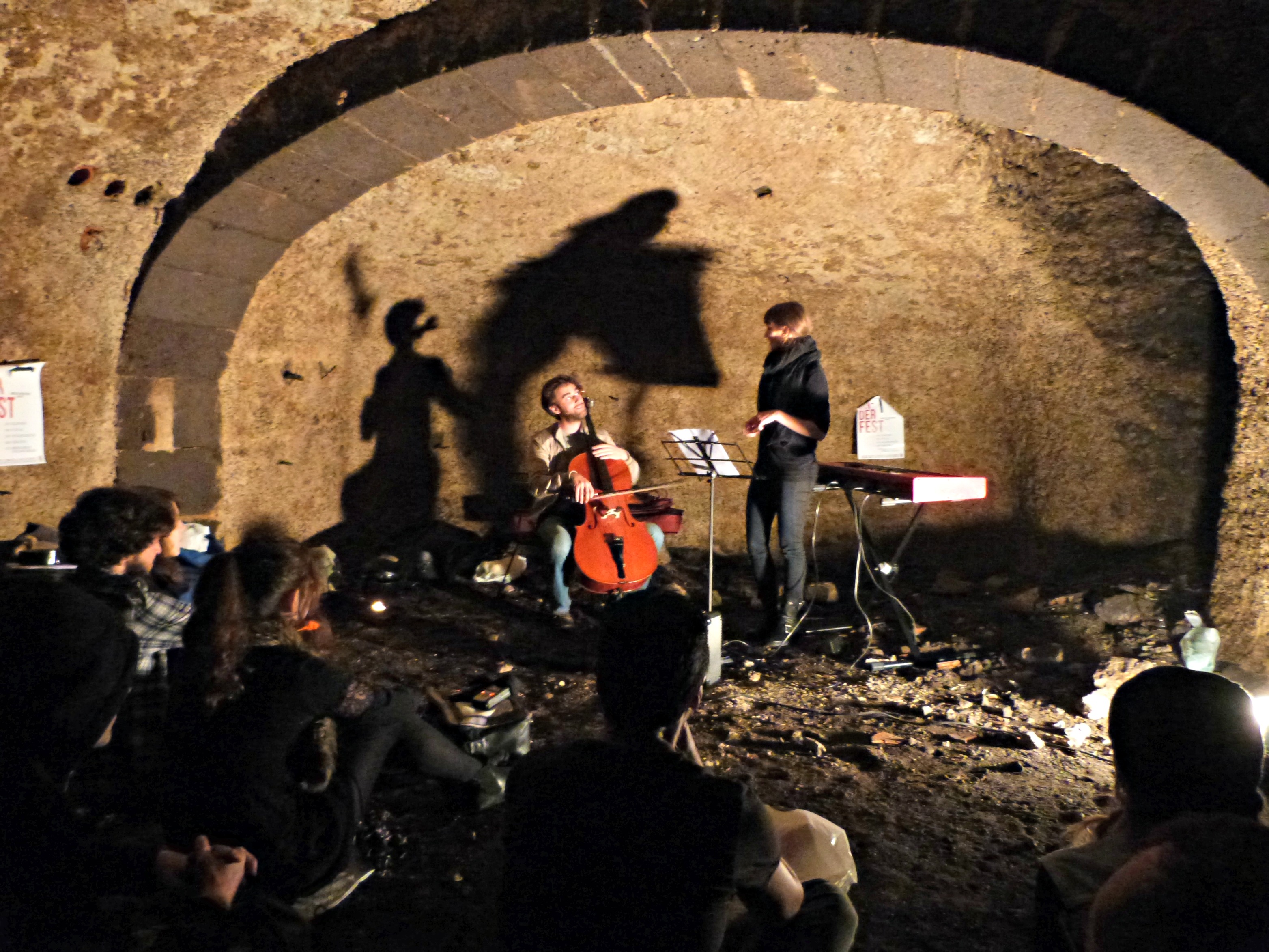 Pour descendre, l’allumage des lampes de poche est obligatoire pour ne pas dégringoler la tête la première. En bas, une immense cave voûtée accueille Morgane Imbeaud et Guillaume Bongiraud, déjà en place. Morgane Imbeaud, c’est la moitié féminine du groupe Cocoon, qui vole désormais de ses propres ailes. Pour ce soir, elle est en très bonne compagnie avec Guillaume Bongiraud, virtuose du violoncelle qui était déjà de la partie avec The Delano Orchestra deux jours avant. Tous deux se lancent dans un set très délicat de reprises que je ne connaissais pas pour la plupart, à part « Skyfall ». Violoncelle, clavier, et la voix cristalline, sur le fil, de Morgane Imbeaud, protégée par une écharpe car c’est que la température est fraîche dans cette cave ! Le public, assis sur une terre battue humide, est sous le charme de ce duo dont la poésie tranche avec l’austérité du lieu. Le set est trop court, encore. A la demande de l’organisateur, nous avons droit à un petit rappel à base d’Etienne Daho, « Comme un boomerang ». Le souvenir de cette soirée me reviendra, tel un boomerang, lorsque j’entendrai cette chanson. C’est certain.