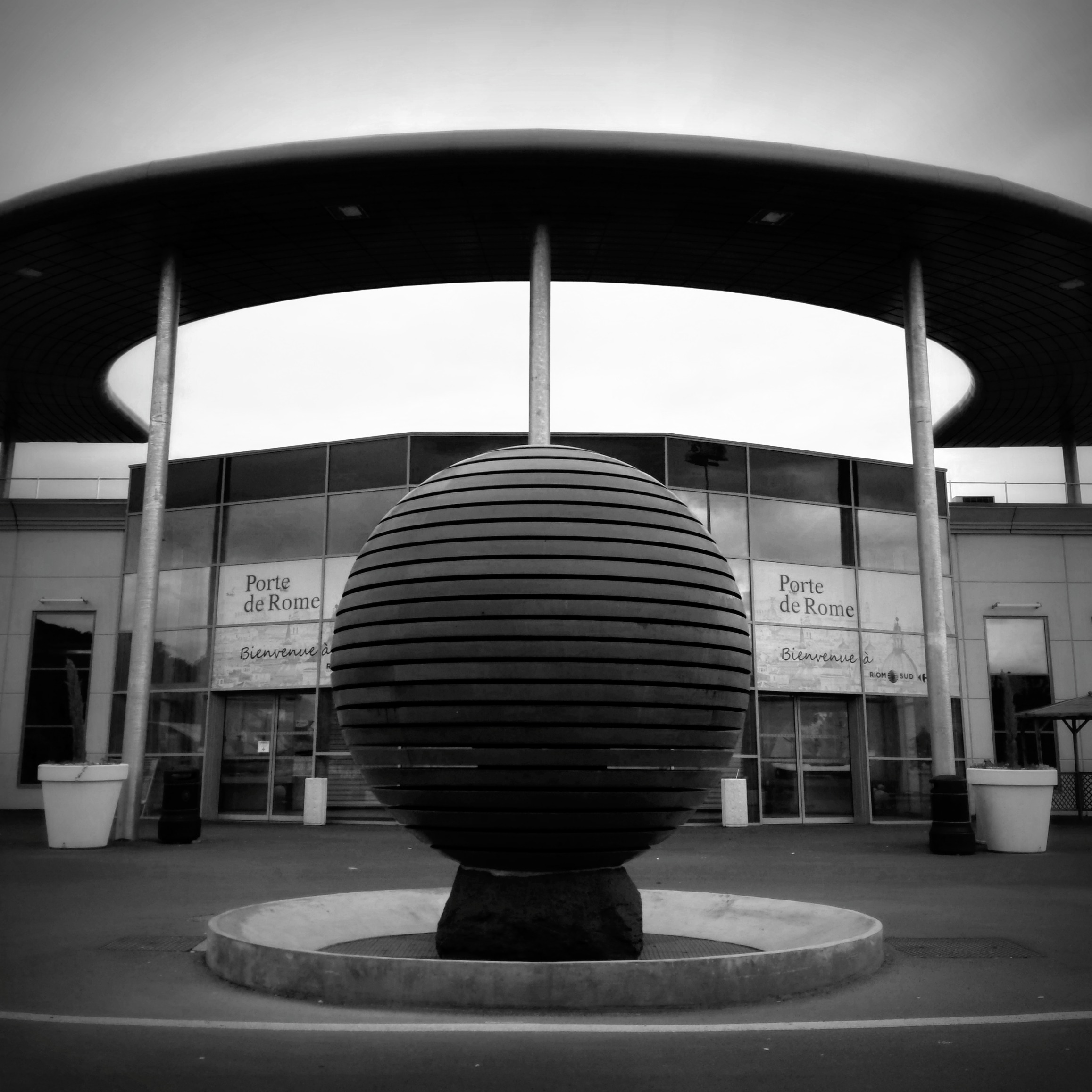 Mais avant, petite pause pour remplir nos estomacs au Liberty (ouvert le dimanche, donc). Alors certes le cadre extérieur n’est pas idéal (Carrouf), mais c’est l’occasion d’admirer une sculpture monumentale de Thierry Courtadon devant l’une des entrées du centre commercial. J’en avais vu une miniature lors de son expo au Conseil général. En ce dimanche midi elle n’était pas en eau mais normalement c’est une fontaine éclairée. Une autre sculpture trône à l’entrée du magasin Leclerc un peu plus loin, également  exposée en miniature pendant l’expo (et actuellement à la gare de départ du Panoramique des Dômes, mais c’est une autre histoire sur laquelle je reviendrai).