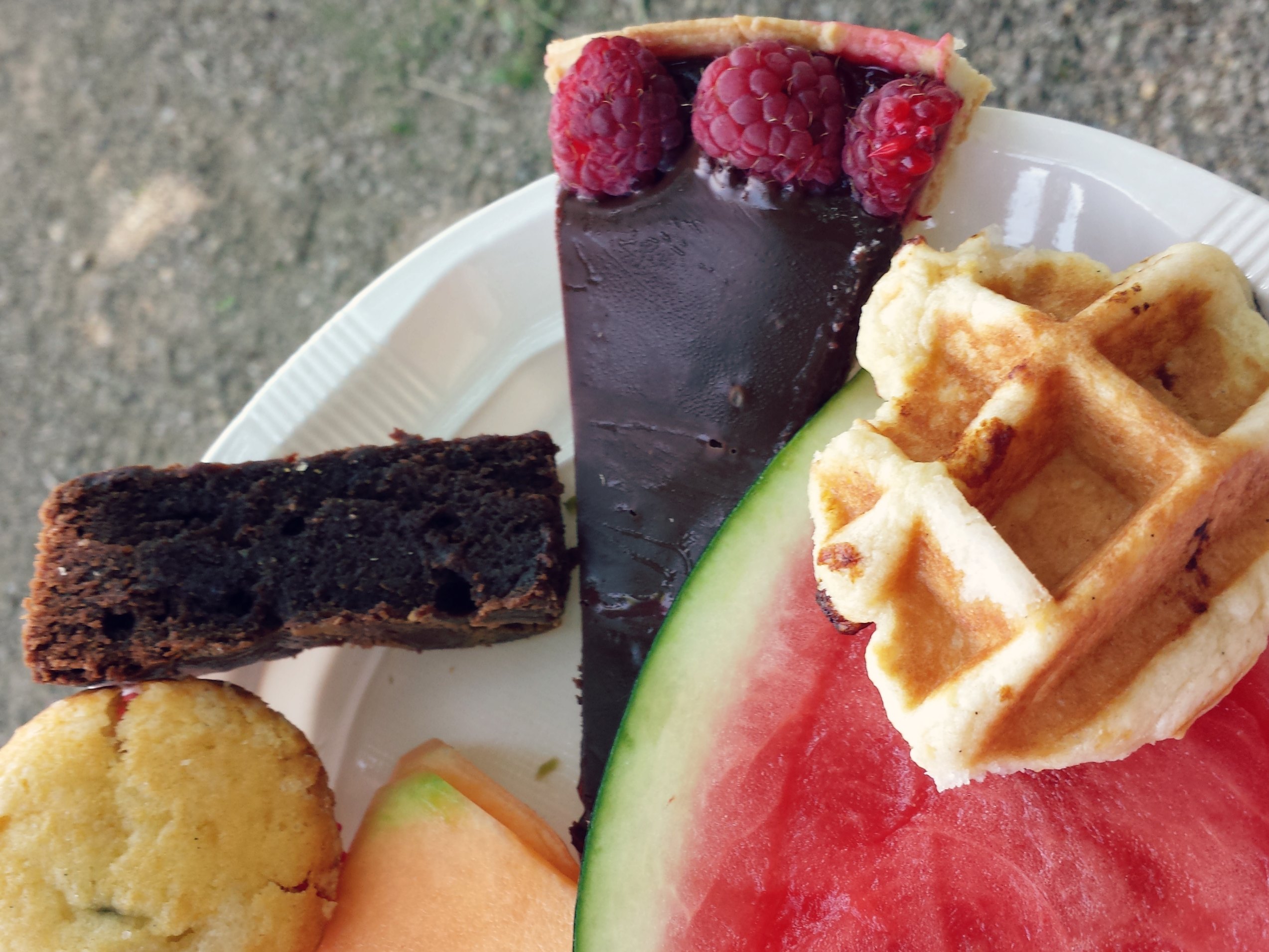 Un pique-nique royal nous attendait, concocté par les bénévoles du festival. Quiches, salades diverses, gaspacho, melon et pastèque et de nouveau les pâtisseries à se damner de Mallorie de L’Armoire à Cuillères qui avait déjà sévi lors de la session urbaine à Clermont ! Je me suis particulièrement lâchée sur le melon et la pastèque, ultra rafraîchissants quand on a soif et chaud ; et la bonne excuse des kilomètres avalés m’a fait prendre quatre desserts différents. Après tout, je ne savais pas ce que l’après-midi me réservait comme effort à fournir, un peu plus de sucre et de glucides n’allaient pas me porter préjudice que diable ! Mention spéciale à la tarte chocolat-framboise… particulièrement gourmande !