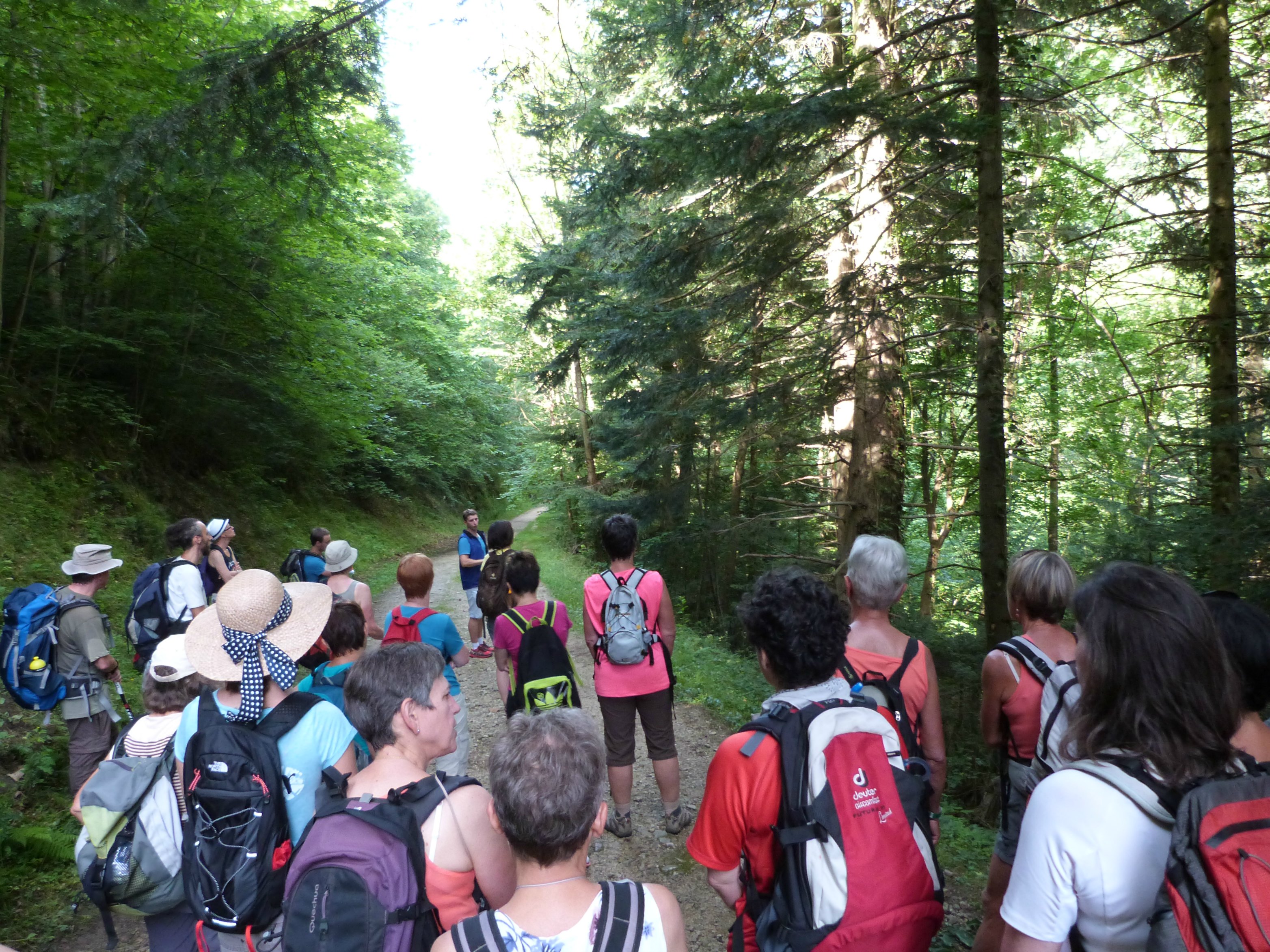 Bracelet au poignet et topo-guide en main, j’ai attendu qu’un premier groupe soit parti pour à mon tour m’élancer sur les pentes de la ville thermale, en compagnie d’une trentaine de personnes. C’est que ça grimpe ! On a attaqué fort ! Première forêt, premier sentier un peu escarpé, premiers ralentissements… puis après une heure et demie de marche, premier arrêt. En pleine forêt de Ceyrat. Là nous attendait Matthias du CRPF Auvergne, pour un petit quiz sur les forêts. Sont-elles publiques ? (non, privées à 83%). Naturelles ? (généralement non). Feuillues ? (pour moitié en Auvergne et l’autre ce sont des résineux). Est-ce grave si on coupe des arbres ? (non, au contraire, ça leur permet de se développer sans s’étouffer). Le papier est-il néfaste pour les forêts ? (non, puisque issu des restes de coupes)… Beaucoup d’idées reçues ont été soigneusement décortiquées et j’ai beaucoup apprécié cette petite pause pédagogique. D’une part je ne connaissais pas le CRPF et ses missions et d’autre part… j’étais bien contente de me reposer un peu, héhé.