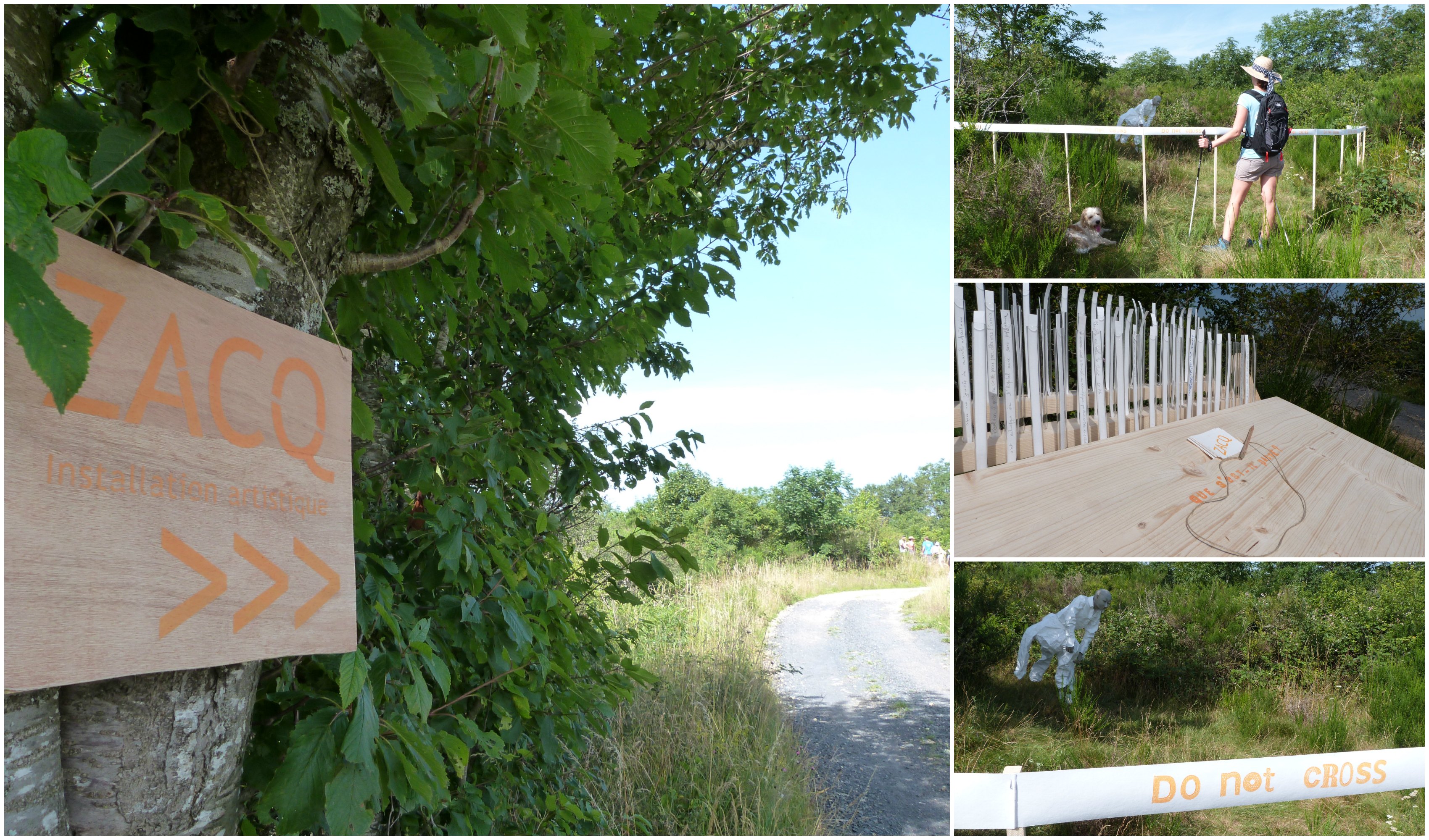 Redémarrage sous les arbres, à la fraîche. Puis nouvel arrêt à Thèdes, plus bref cette fois-ci, pour découvrir l’œuvre « ZACQ » par le B.O Collectif, constitué de deux plasticiens et une céramiste (Vinz, ChaHub et Charline M.) venus nous interroger sur l’interprétation de leur œuvre (Zone d’Anticipation Cataclysmique en Question). Scène de crime protégée par un ruban, personnage en fâcheuse posture… les randonneurs étaient invités à formuler leurs hypothèses sur des petits papiers disposés ensuite dans des éprouvettes. La mienne n’avait pas grand-chose à voir avec l’environnement mais pour le coup, elle était ultra spontanée, j’ai écrit la première chose qui m’est venue à l’esprit ! Donc je me dénonce : le mannequin évadé des Galeries Lafayette, c’était moi ! Arf…