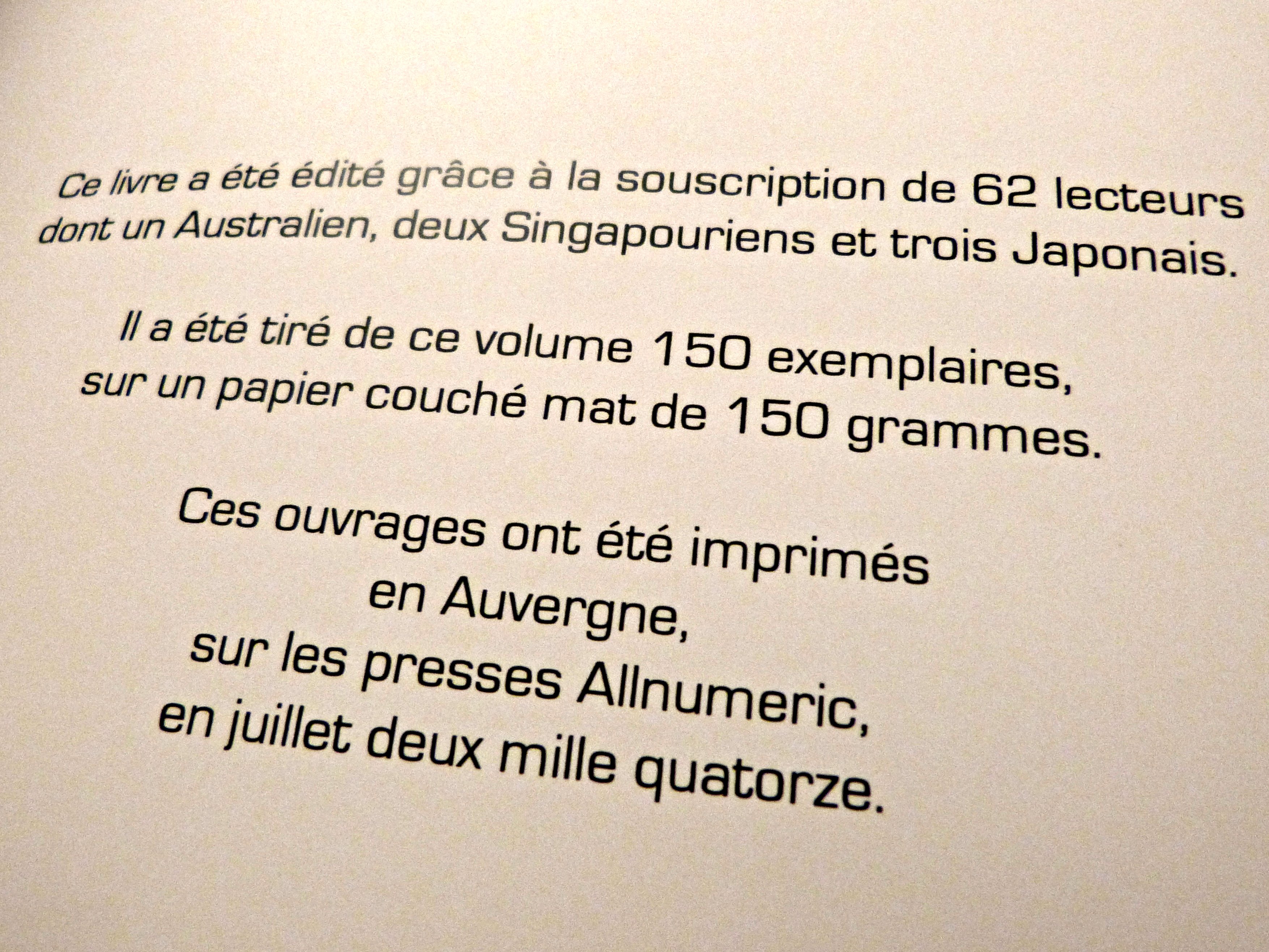 Je fais partie des 62 lecteurs ayant souscrit à cette publication. L’impression a été faite en Auvergne chez Allnumeric, qui a fait (comme d’habitude) du bon boulot. Je suis un peu fière d’avoir contribué à mon petit niveau à ce beau projet.