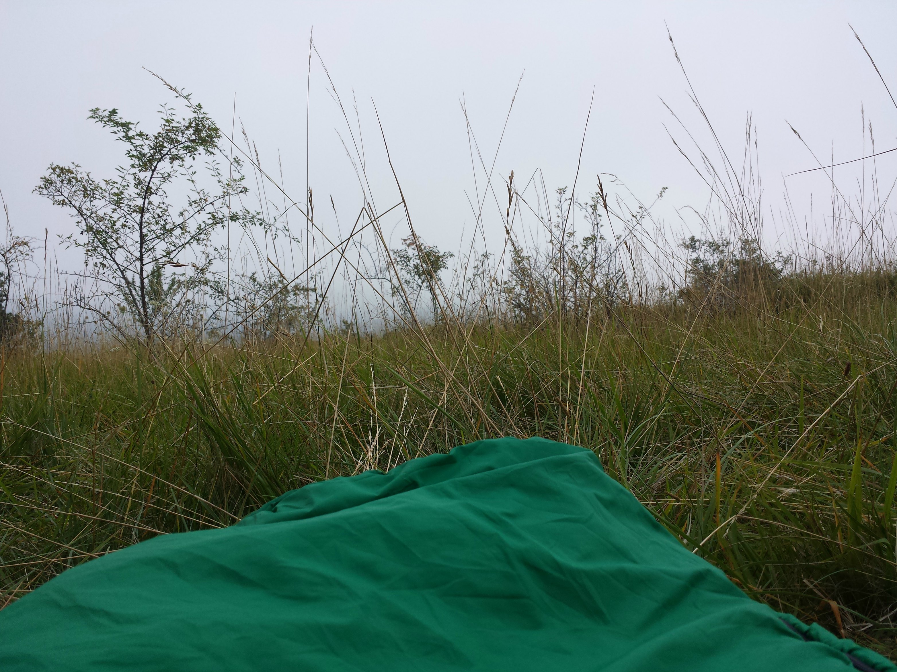 Sous les étoiles, couchés dans les herbes au son lancinant des grillons. Vais-je dormir ? Ma plus grande crainte était le noir total. Finalement on y voit clair, enfin, un peu. Mon autre crainte était le froid. Je crève de chaud dans ce duvet spécial grand Nord et mon pyjounours. Une autre angoisse était que des bestioles investissent mes oreilles, mes narines, ma bouche, viennent se lover contre moi dans le duvet ou slalomer entre mes orteils. Y a personne. Enfin si. Un insecte non identifié (un grillon ?) me chante inlassablement la même mélodie à quelques centimètres de mon oreille gauche. Le Trappeur m’apprendra plus tard qu’il était en fait bien plus loin. A bien y réfléchir je pense que c’est ce qui m’a empêché de dormir. Car j’ai très peu dormi, mon Flex est là pour le prouver. Après avoir tourné un moment dans le duvet à la recherche d’une position confortable que je n’ai jamais trouvée, je finis par m’assoupir. Et je me réveille ce qui me semble être quelques minutes plus tard, sur le dos, avec au-dessus de moi un ciel étoilé comme je n’en avais jamais vu auparavant, avec voie lactée et tout le saint-frusquin. Forcément, je bloque sur ce ciel, les étoiles, notre pollution urbaine lumineuse qui nous en masque la plupart, pis de toute façon on est enfermé chez soi à la nuit tombée, alors à quoi bon ? Je ferme les yeux quelques minutes. Peut-être même que je me rendors. Je les rouvre et de gros nuages ont recouvert le puy. Finie l’astronomie. Je cogite, je réfléchis à ce que je fais là, à l’écoute des moindres sensations, je cherche des formulations pour les quelques mots que je vais écrire au petit matin sur des cartes que j’ai apportées. Et je me rendors. Et je me réveille. Et ainsi de suite. J’ai trop chaud. Je sors la tête du sarcophage mais par peur des insectes, l’y remets aussitôt. J’ai l’impression que mon agitation réveille Le Trappeur à chaque fois. J’essaie de faire le moins de bruit possible. A l’aube, les grillons lancinants décident enfin d’aller se coucher. Je dors mieux malgré un petit vent qui s’est levé. Le vent, le vent frais sur mon visage, probablement l’expérience la plus agréable de cette nuit sous la voûte céleste. Puis je me réveille et le jour est là. Enfin, apparemment.