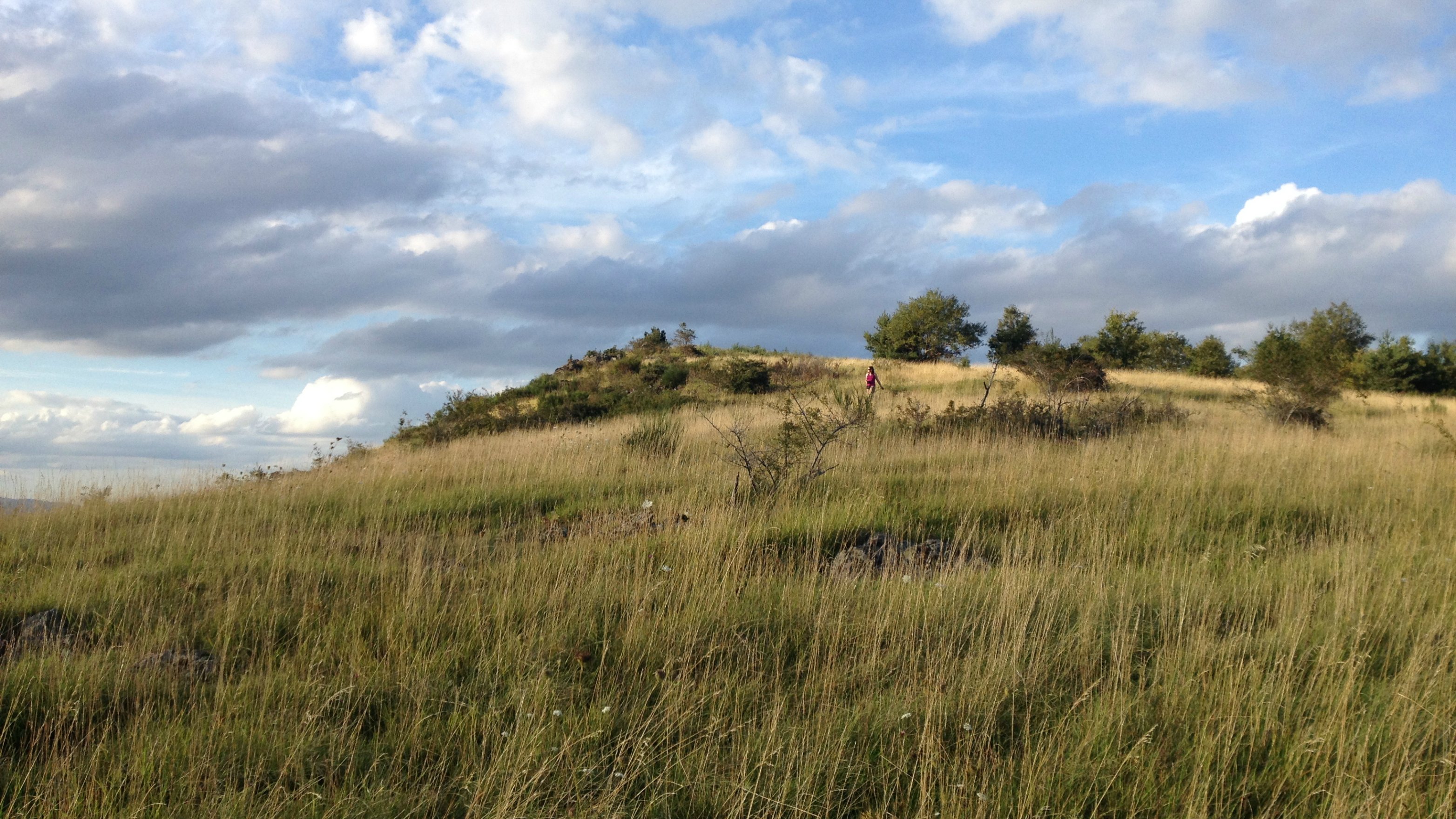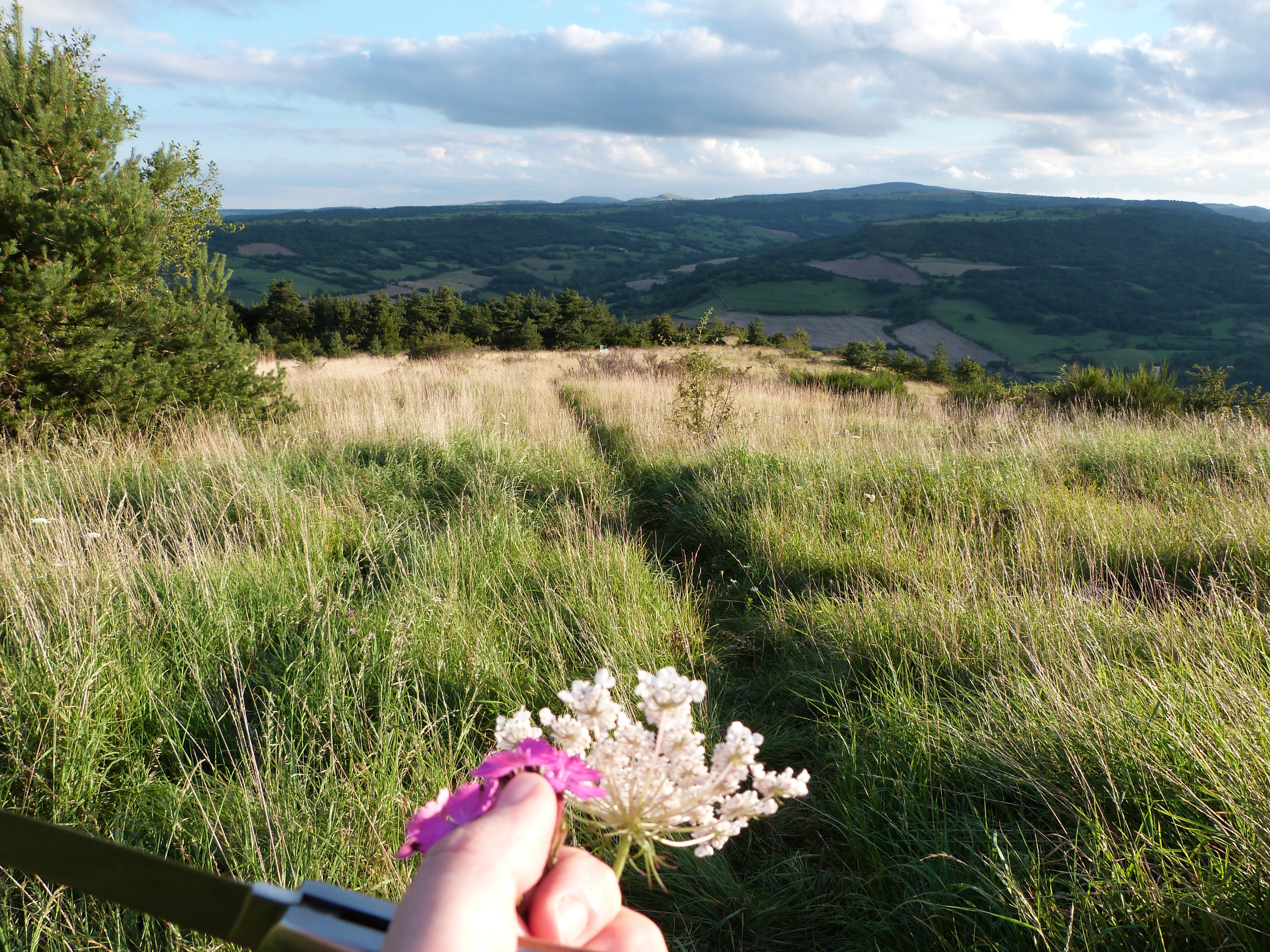 Sur place… l’installation. Le Trappeur me demande de choisir mon emplacement idéal. Je n’y connais rien, je lui laisse cette responsabilité sur la foi de sa longue expérience du bivouac. Et tandis qu’il s’échine à monter la tente (« au cas où »), gonfle les matelas… pardon… déploie les matelas auto-gonflants (c’est important, attention, pas pour la suite de l’histoire mais pour la fierté du Trappeur), installe duvets et tapis de sol, sort le matériel pour le dîner… et bien moi… je joue à la belle des champs de Lavelle dans les herbes hautes. Je remonte au cairn à grandes enjambées par-dessus les ombellifères. C’est le seul endroit, j’avoue, où la 3G est de qualité pour inonder les réseaux sociaux de mes exploits. Je m’extasie longuement sur cette vue fascinante avant de redescendre au campement, telle Laura Ingalls (mais je ne suis pas tombée), cheveux aux quatre vents et fleurs sauvages à la main afin de réaliser une œuvre de land art dans le soleil déjà couchant.
