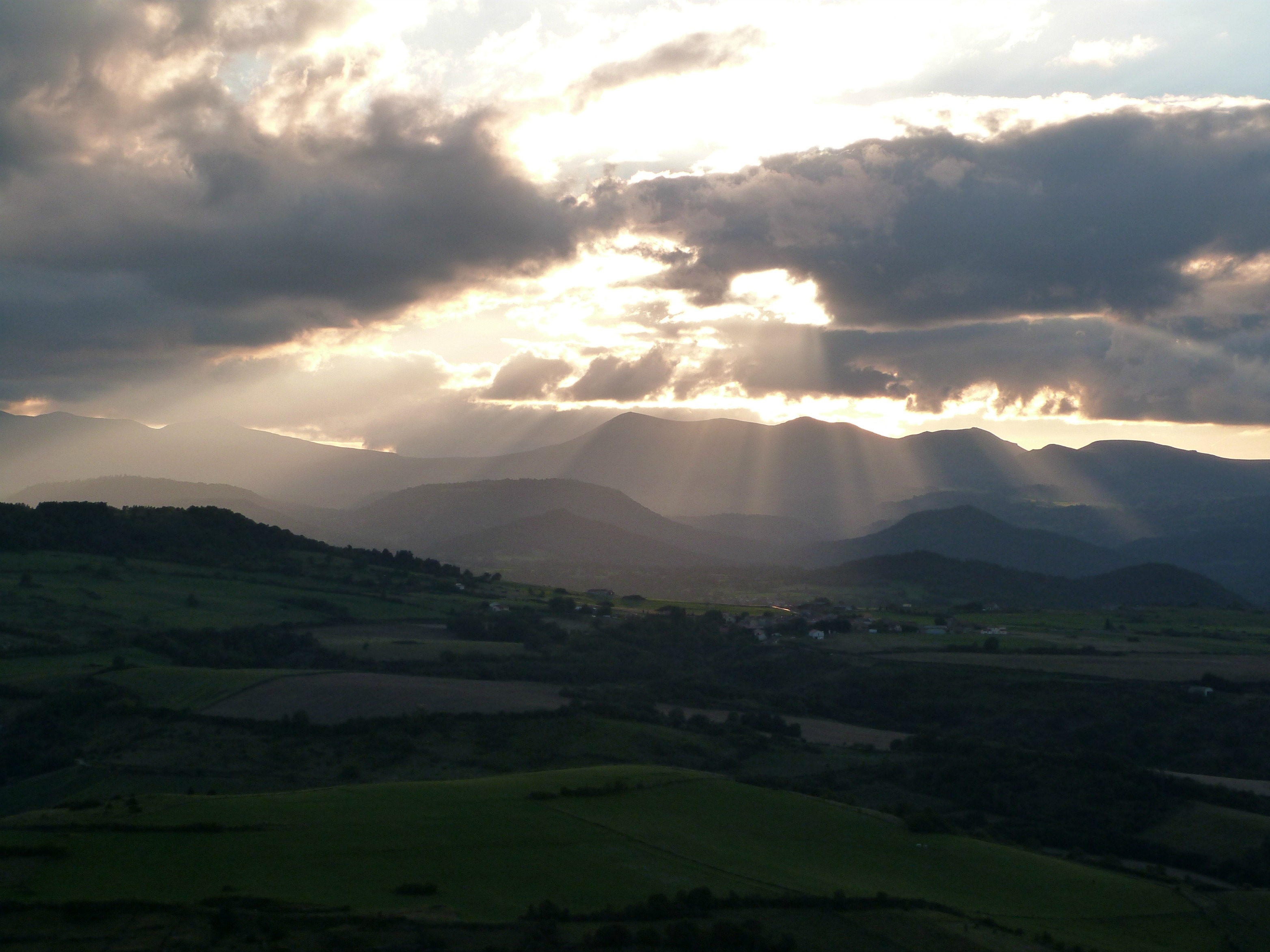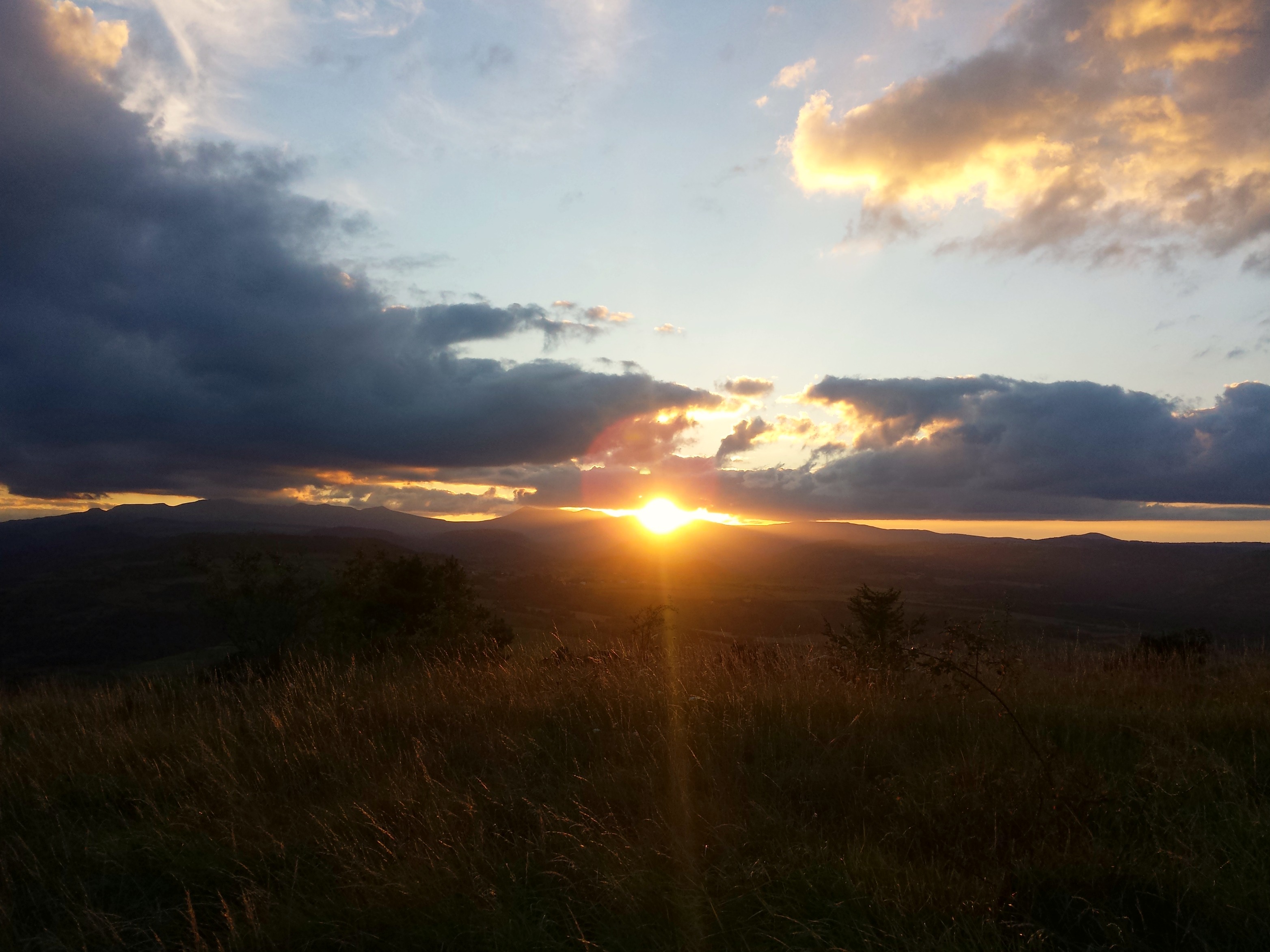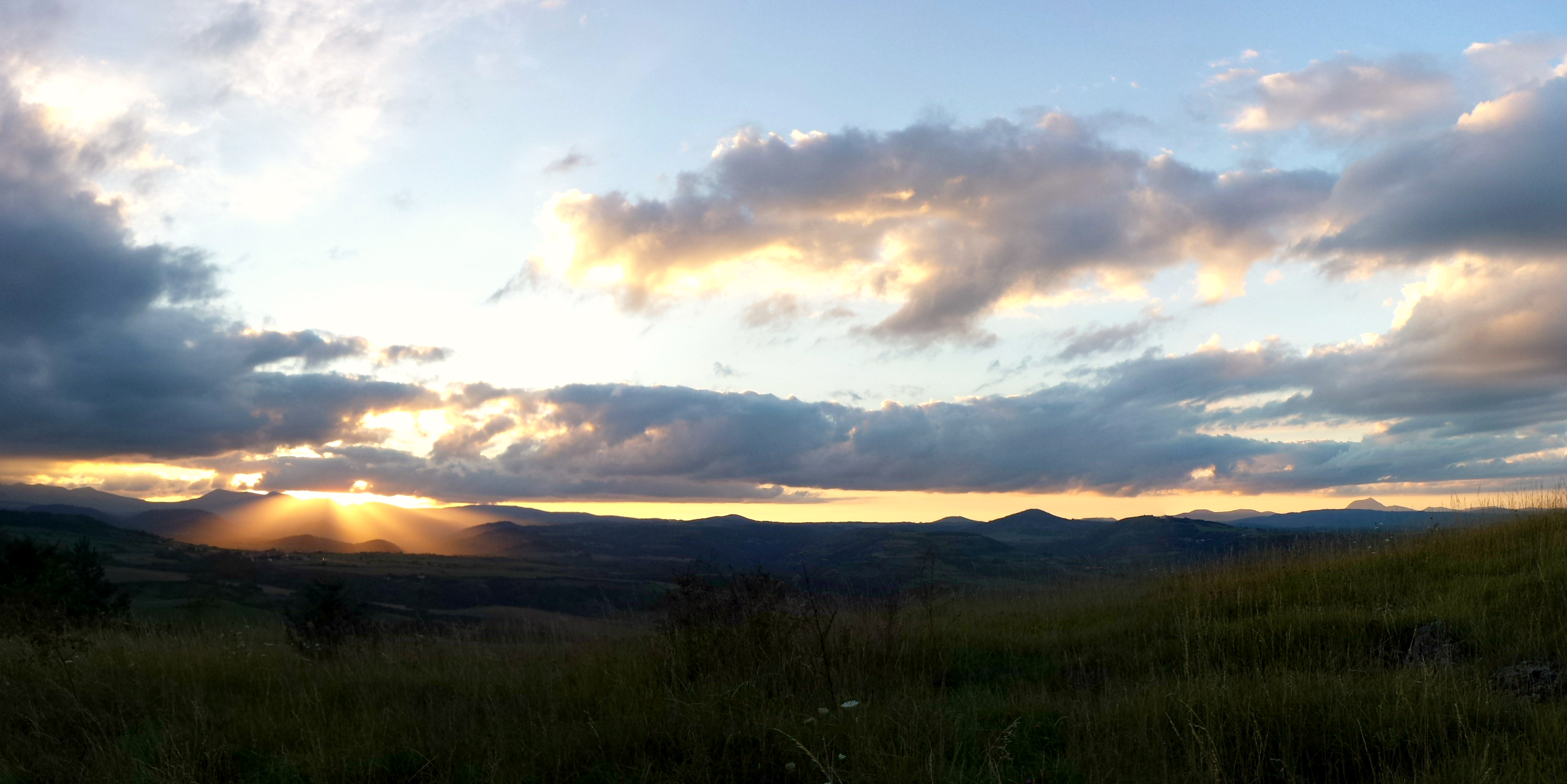 Le soleil couchant tiens… parlons-en. Quelle claque ! De gros nuages noirs épargnant miraculeusement nos appartements du soir, s’étirant sur l’horizon de chaque côté, et une lueur surnaturelle, hypnotique, mystique, qui se répand sur les monts du Sancy. Ça va vite, trop vite, on voudrait que ce spectacle dure encore un peu, et même beaucoup, parce que c’est beau déjà, et même somptueux, mais aussi parce qu’après, comme un couperet, tombe la nuit. La nuit noire loin de tout mobilier urbain lumineux, qui va s’étirer mollement jusqu’au petit matin et rallumer la vie sur notre puy.