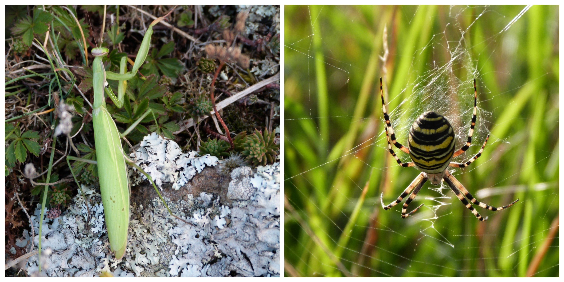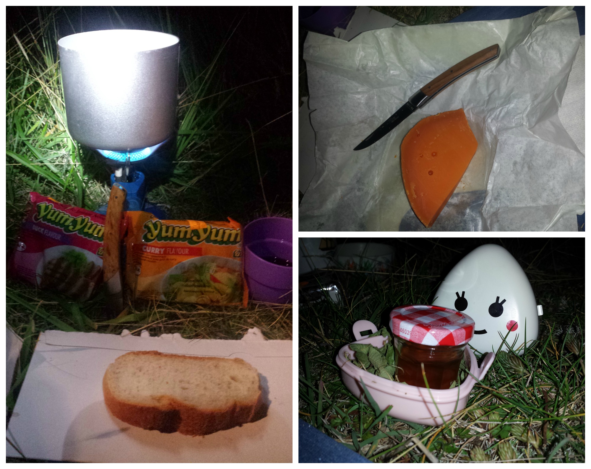 Des pâtes chinoises cuites sur le réchaud nous apportent ensuite un petit réconfort dans la nuit fraîche, suivies de près par de la mimolette vieille tranchée avec mon Thiers (fabriqué de mes blanches mains il y a quelques années), puis par une crème Mont-Blanc pour terminer. Quelques notes de Bon Iver crachotées par le haut-parleur de l’iPhone accompagnent une verveine au miel de bourdaine que j’ai apportée dans un récipient de super baroudeuse (hem…), avant que n’arrive l’heure de  s’engouffrer dans les duvets sarcophages, car le froid et la fatigue – le vin aussi – commencent à distiller leurs effets sur les organismes éprouvés. Mais avant… pipi (seulement… et oui ! Quelle déception…), brossage de dents et pyjama ! Un bivouac en pyjama… non mais tu parles d’une aventure ! En pyjounours d’ailleurs, en ce qui me concerne. Changement rapide dans la tente, qui du coup sert de cabine, avant faufilage dans le duvet (et foutage de gueule sur les nounours). Au moment de m’allonger, je vois passer un truc ressemblant à une araignée verte sur le matelas, et qui file vers les herbes hautes. Ça promet. Surtout vu les spécimens croisés pendant le jour, mante religieuse et autre araignée jaune géante embusquées entre deux brins d’herbe. Pour l’heure, seuls les grillons se font remarquer par leur sérénade entêtante. Il est temps de chercher le sommeil.