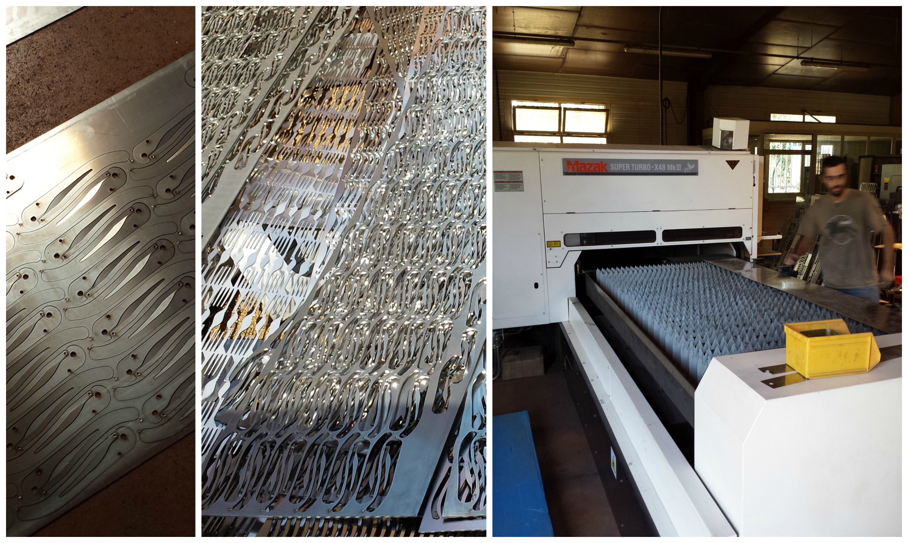 Direction l’atelier justement ! Première surprise, je m’attendais à une « usine » beaucoup plus grande, remplie de grosses machines fonctionnant toutes seules et crachant les couteaux tout montés en bout de chaîne. Que nenni ! Dix-huit personnes polyvalentes travaillent presque « à l’ancienne » sur des postes de travail représentant chacun une étape de fabrication du couteau (ou de la fourchette, ou de la cuillère…. la coutellerie c’est beaucoup plus que du couteau, ça peut être du scalpel, des disques pour hachoirs, etc.). Tout commence avec l’arrivée de grandes plaques d’acier qui sont enfournées dans une machine qui les découpe façon « emporte-pièce » grâce à un paramétrage numérique. Les formes sont bien sûr élaborées par les designers de l’entreprise. Plusieurs dizaines d’étapes sont nécessaires à l’élaboration d’un couteau. Nous ne les avons pas toutes passées en revue mais avons pu nous rendre compte de la minutie avec laquelle chaque pièce est travaillée par chaque personne : émoulage, fixation des « abeilles », polissage… Toutes les opérations sont réunies sous le même toit mais autrefois, un couteau se baladait de maison en maison, chaque « ouvrier » étant spécialisé dans une tâche particulière. Le client final récupérait une pièce qui avait voyagé de main en main, de rue en rue, de ville en ville. Une œuvre collective. J’aime cette idée.