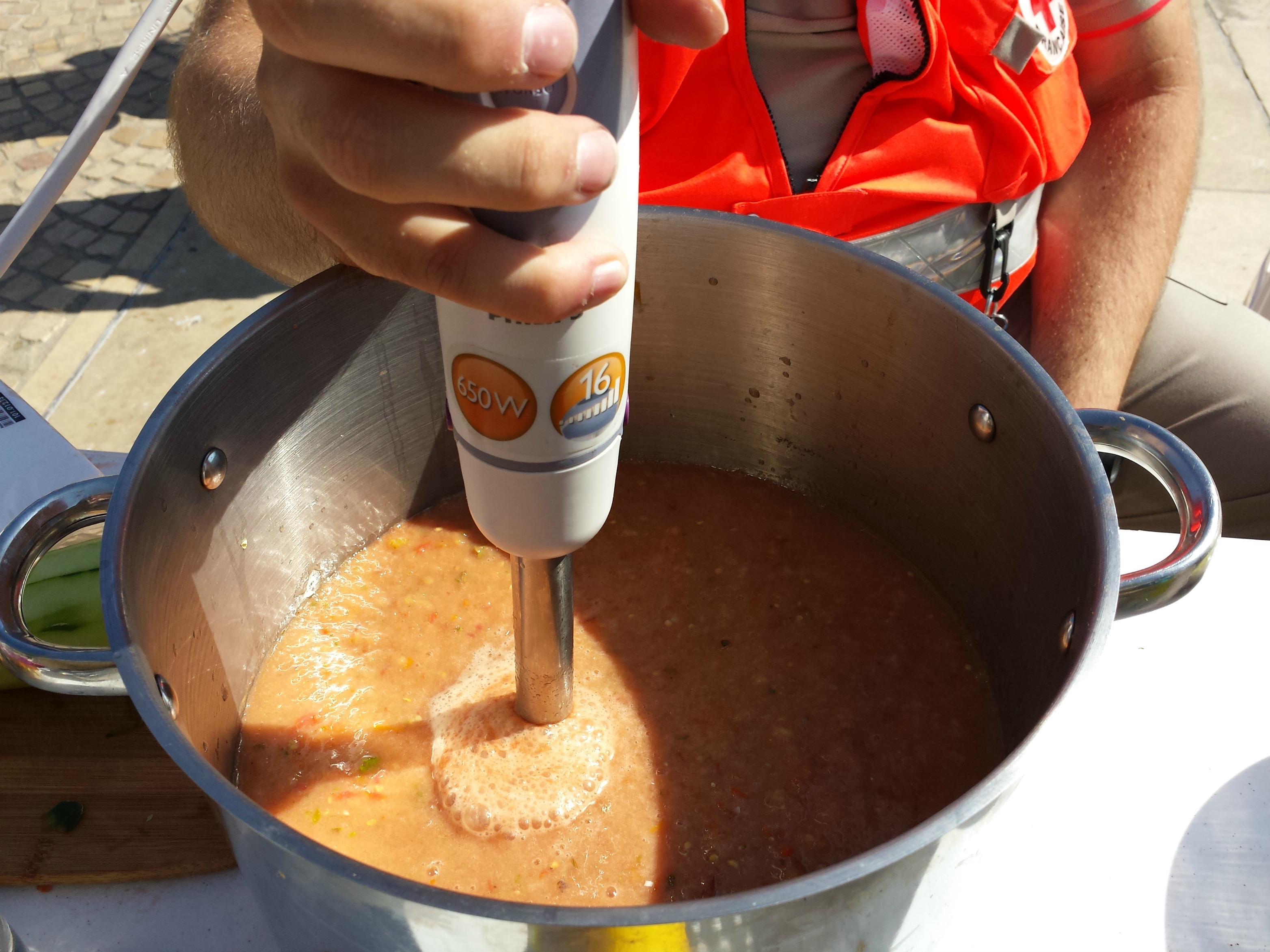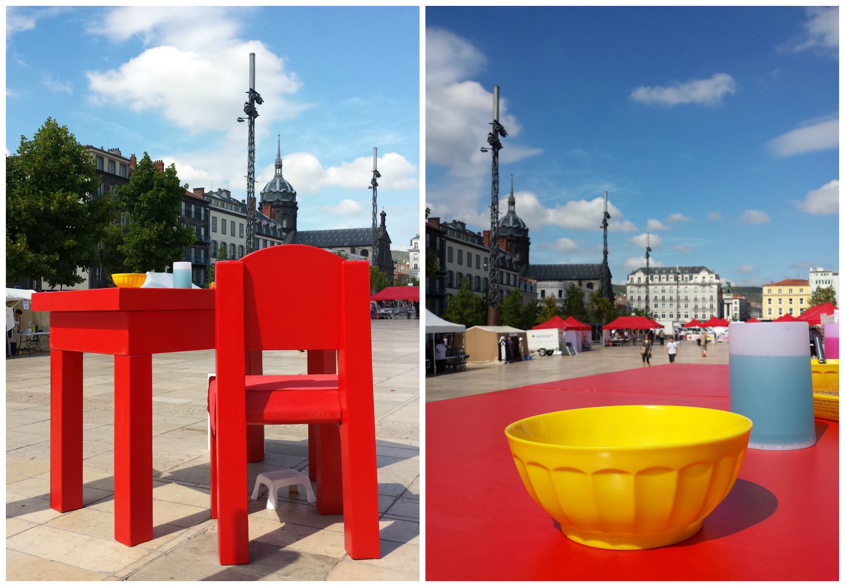 A l’occasion d’une grande journée d’animations organisée par la Croix Rouge française, place de Jaude à Clermont-Ferrand, j’ai participé à une Disco Soupe animée par l’inoxydable et pétillante Clémence, Dominique du foodtruck Roul’ ma soupe, et Pauline, d’Animafac. Les légumes ont pour grande partie été fournis par la Maison de l’Alimentation locale et le Pré du Puy, le fromage glané au Marché Saint-Pierre, Clémence et Dominique s’étant chargées d’apporter les indispensables couteaux, sel et autres gamelles et condiments. A mon arrivée à 11h, elles étaient déjà au boulot, accompagnées par un bénévole de la Croix Rouge, affairé à débiter des courgettes en petits morceaux.