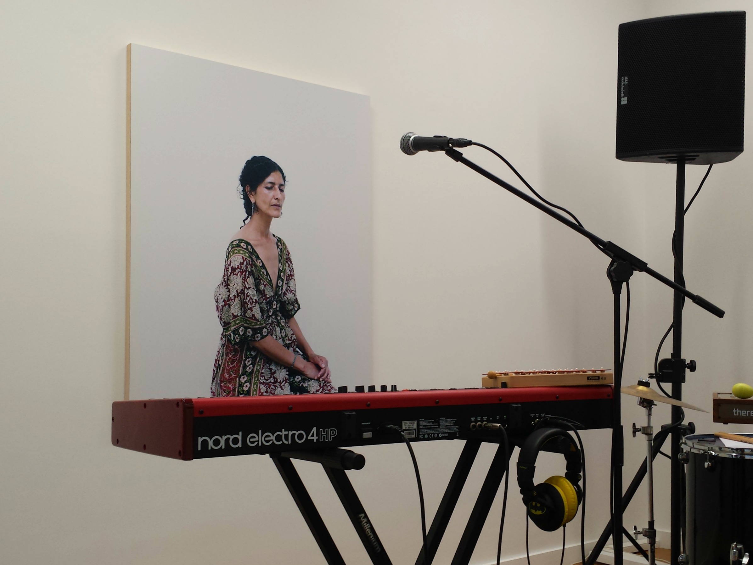 Puis nous avons été invités à monter à l’étage avant le set de Jólakottür. J’ai eu le temps de faire un rapide tour des œuvres d’Eric Poitevin et force est de constater que parfois, l’ajout d’éléments extérieurs fait prendre aux œuvres une toute autre dimension. Cette femme aux yeux baissés n’a cessé de hanter le set du groupe, au point de s’approprier le bras d’un musicien sur l’un de mes clichés. Musicalement, la formation aux fortes inspirations islandaises va puiser plus dans le répertoire pop folk d’un Sin Fang que d’un Sigur Rós mais le voyage était beau, chaleureux.