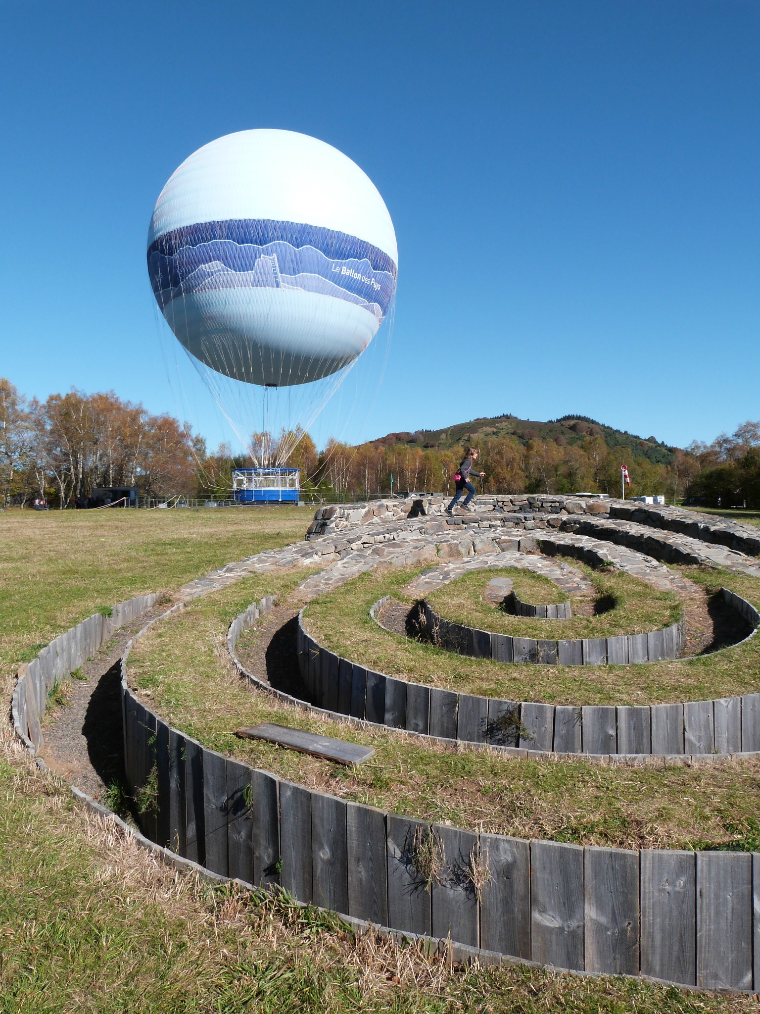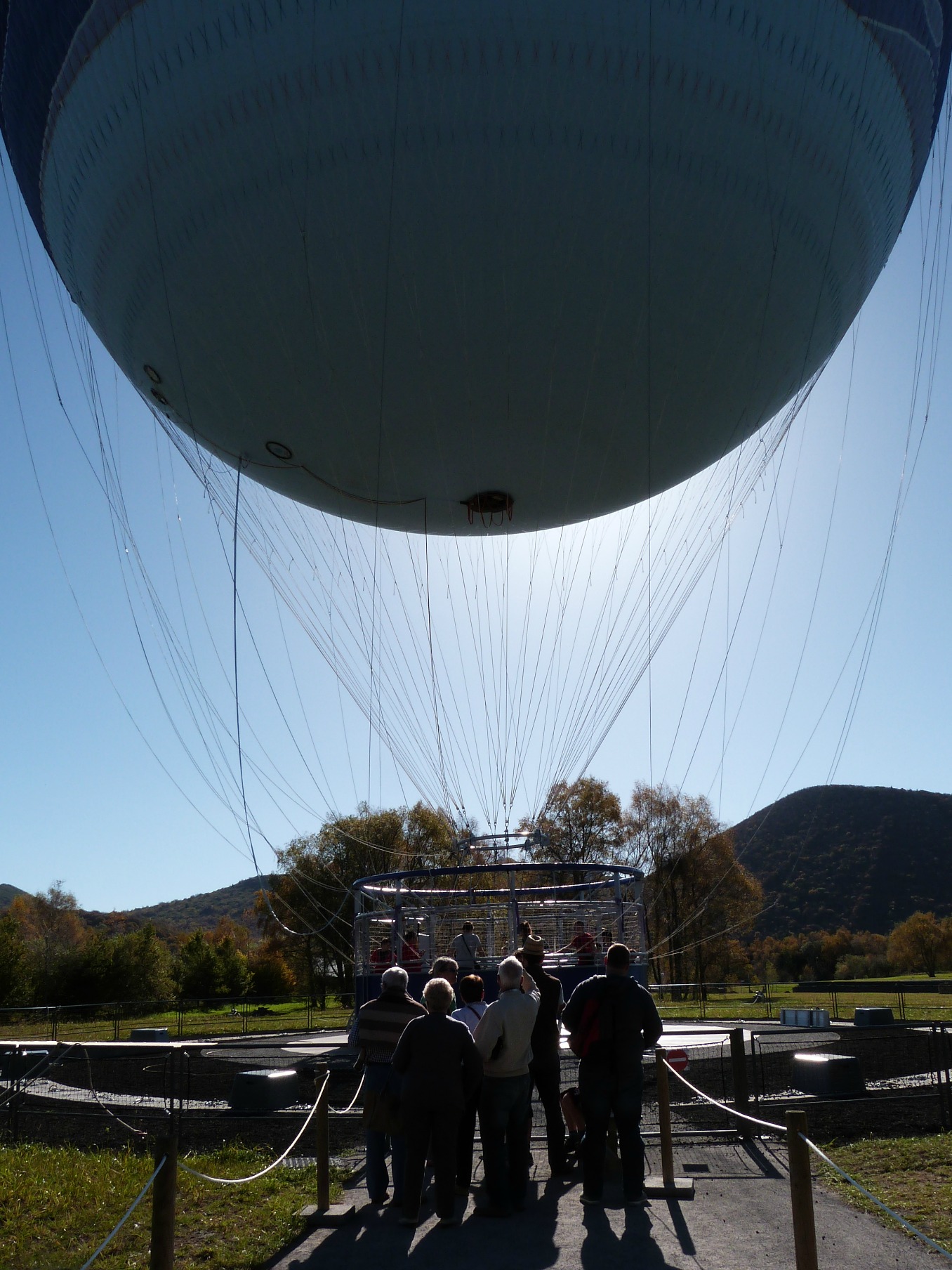 10h30 un samedi 1er novembre… un peu de monde sur le parking mais à l’intérieur du parc, peu d’attente aux attractions (mais suffisamment pour faire piétiner Flora). Désignée d’office guide pour la journée, j’ai choisi d’attaquer par le clou du spectacle (pour moi en tout cas, qui connais déjà bien le parc), le Ballon des Puys. Ce ballon n’est pas à proprement parler une montgolfière car il est rempli d’hélium (et non d’air chauffé) et solidement arrimé au sol par un câble. Il peut monter jusqu’à 150 m mais ce matin-là… une petite brise à peine perceptible au sol tirait vigoureusement sur le câble dans les airs. Nous sommes montés à peine à 100 m et n’avons pas traîné pour redescendre. L’aérostier a ensuite fait une pause dans les vols le temps que le vent se calme (conclusion : on a eu du bol !). Cette attraction est donc fortement impactée par les conditions météo et ce n’est pas parce qu’il fait grand beau que c’est une garantie de pouvoir y monter ! Niveau sensations… la « nacelle » est en fait un anneau autour duquel se répartissent les visiteurs (une vingtaine au maximum mais ça peut être moins si l’animateur le décide) et le trou central peut paraître vertigineux. Mieux vaut regarder le paysage alentour et de toute façon c’est fait pour ça ! Vue sur le puy de Dôme, le puy de Côme, le volcan de Lemptégy, un bout de Sancy, les Combrailles… de quoi en prendre plein les yeux. Sachez que l’aérostier est capable de « conduire » le ballon et de le faire poser en cas de rupture du câble (je dis ça, on ne sait jamais^^…). Cette attraction est accessible moyennant un supplément de 4,50€ par adulte (3,50€ ou 2,50€ pour les enfants selon leur âge) et la file d’attente peut vite s’étirer en cas de grosse journée et/ou de météo capricieuse. Nous avons attendu environ 30 mn avant d’embarquer, ce qui est tout à fait correct même si on a eu très chaud en plein soleil (m’enfin on va pas se plaindre).