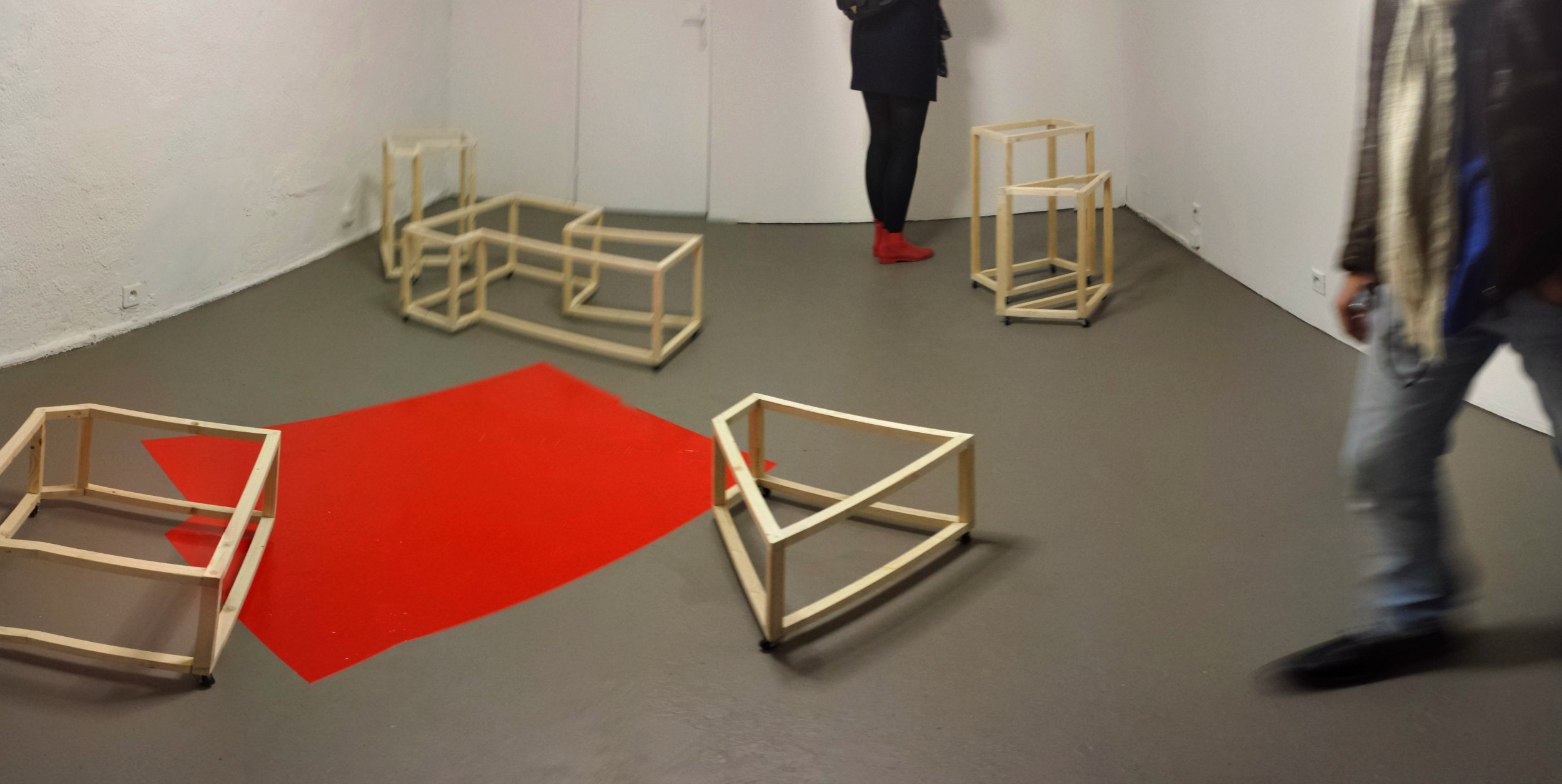 Vous pourrez même passer lundi, jeudi, ou samedi ou carrément dimanche, coller votre nez aux vitres  et constater que… l’installation s’est regroupée, pelotonnée sur elle-même, rassemblée autour de cette tache rouge au sol, qui est, si vous êtes observateur, la réplique en miniature de l’unique pièce de La Permanence.