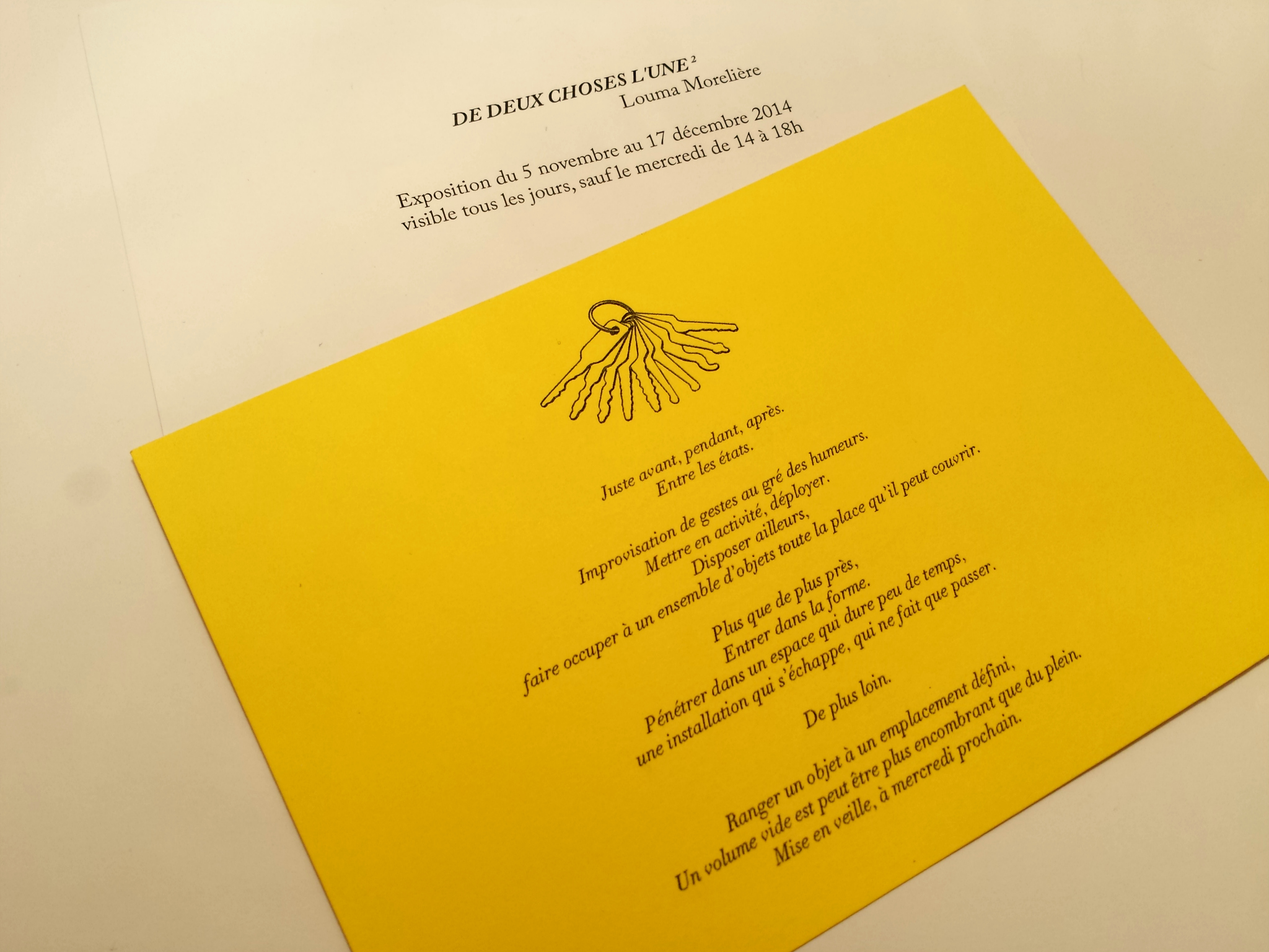 Louma Morelière exploite avec malice l’exiguïté du lieu, son calendrier aussi. Son œuvre respire au rythme de celui qui viendra lui ouvrir les portes, et disperser ses pièces selon son humeur du jour. De deux choses l’une nous parle d’architecture autant que d’espace-temps. De deux choses l’une nous demande si elle existe toujours quand nous ne sommes pas là pour la voir et l’admirer, ou si la porte est fermée. Existe-t-elle hors de notre volonté  de la voir œuvre d’art ?