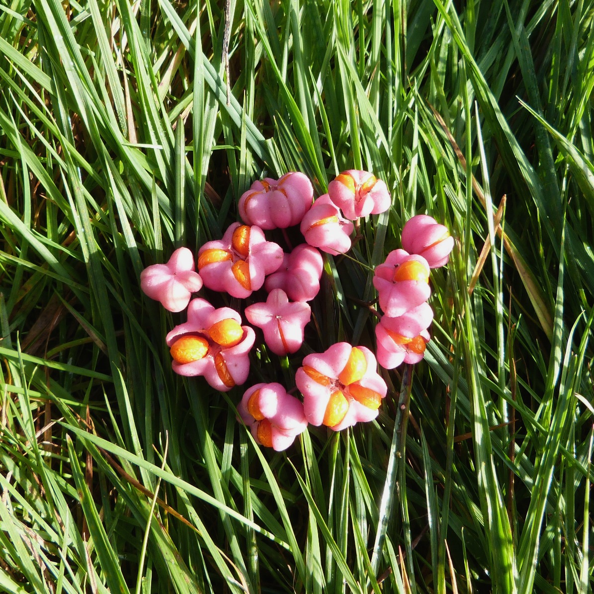 J’en ai profité pour faire un peu de mylittlelandart vite fait. J’ai découvert une plante inconnue de moi jusqu’alors. C’est un buisson qui perd toutes ses feuilles en laissant des fruits de toute beauté. Roses, ils s’ouvrent pour laisser entrevoir des baies orange. Une petite recherche sur internet et bim ! C’est du fusain « bonnet d’évêque ».