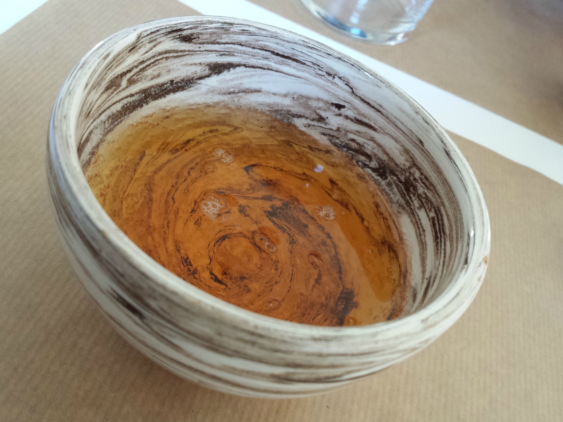Je note aussi ce joli bol à cidre en terres mêlées tournées. Qui répond aux stries de chocolat sur ton assiette. Le souci du détail !