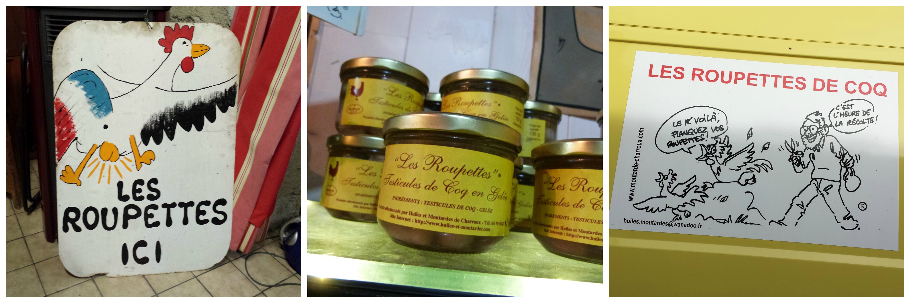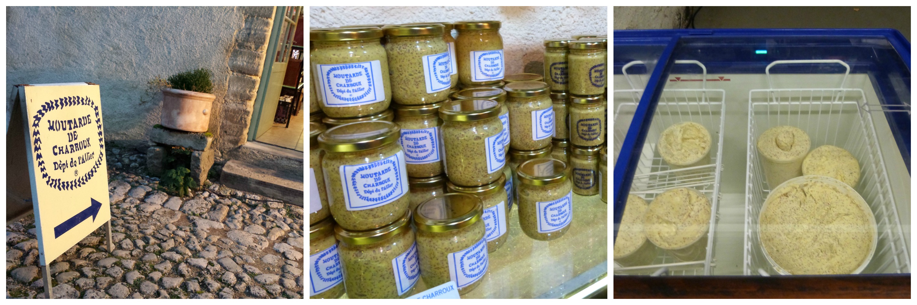 A 17h, coup d’envoi ! Devant la maison du tourisme, on avait dressé un stand pour la vente des bols. Le principe de la fête de la soupe ? On achète son bol 8€ (fait par le potier du village), et ensuite… open bar auprès des 43 stands de soupe disséminés dans tout le village, jusqu’à épuisement des marmites mijotées par les habitants. Entre 17h et 19h (coup d’envoi officiel de la soupe), les soupophiles ont le temps de flâner dans les ruelles et de découvrir les petites boutiques d’artisans. On trouve à Charroux de jolies bougies artisanales (on les trouve aussi à Clermont), des sucettes bio-équitables chez La Boîte à Sucre, des confitures à la Confiturerie de Charroux, du safran, des savons… et bien sûr, de la moutarde. Charroux est le haut lieu de la moutarde artisanale, classique ou aromatisée à toutes sortes de choses. J’en ai profité pour acheter des spécialités qui n’arrivent pas (à ma connaissance) jusqu’à la capitale auvergnate, comme la moutarde au pourpre de Saint-Pourçain ou au miel. Par contre… je n’ai pas acheté de roupettes. Merci mais non merci. C’est l’autre spécialité de cette boutique, les roupettes de coq en gelée. Heureusement, ils n’en avaient pas mis dans leur soupe !