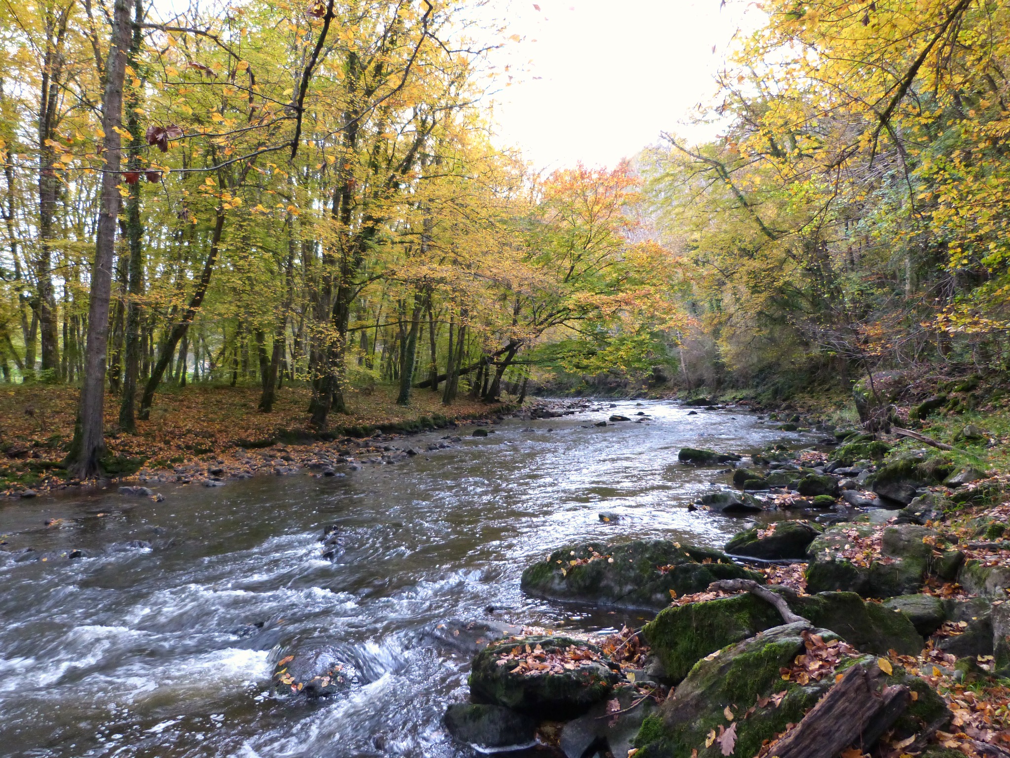 Car j’ai découvert de manière bien trop furtive les gorges de la Bouble, en contrebas de l’abbaye. Des sentiers de randonnée permettent de longer la rivière ou de la surplomber, des vestiges de moulins émergent de la végétation luxuriante, de charmants petits ponts permettent de traverser le cours d’eau… bref, je veux en voir plus ! Dommage que ce jour-là le ciel ait été un peu plombé, car les couleurs d’automne étaient superbes. En été ces gorges doivent être également très agréables pour leur fraîcheur.
