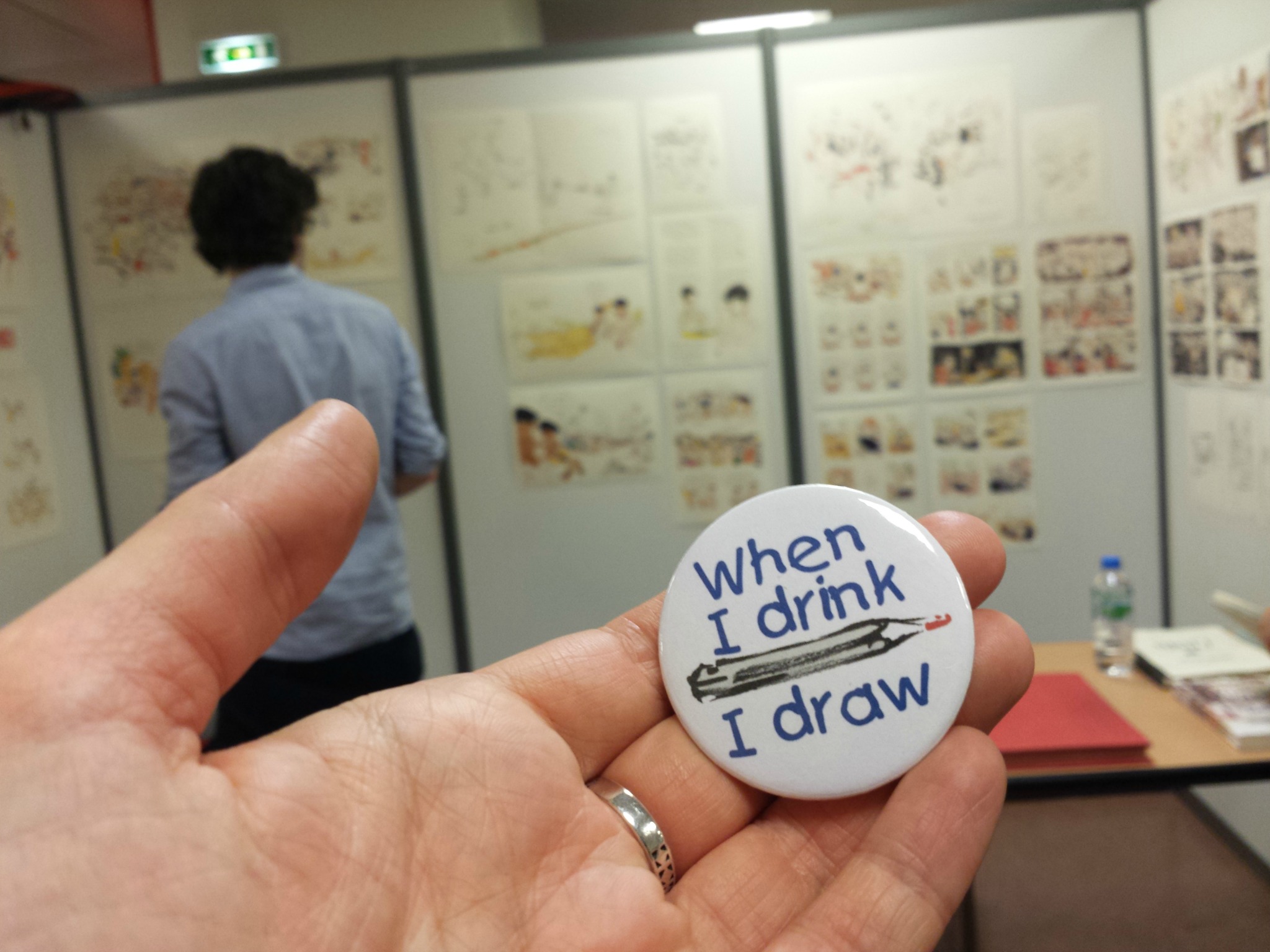 J’ai également noté les deux belles vitrines consacrées à Tazab et Ricardô, que j’ai eu le plaisir de voir travailler lors du fameux sketchcrawl au jardin Lecoq. Un peu fière de me voir trôner dans la vitrine, croquée par Tazab lors d’un drink & draw où j’avais surtout drinké, tweeté mais fort peu dessiné, malgré les conseils avisés de Tazab. Du coup j’ai investi dans un petit badge qui me va bien mais qui est légèrement difficile à porter hors contexte ! ^^