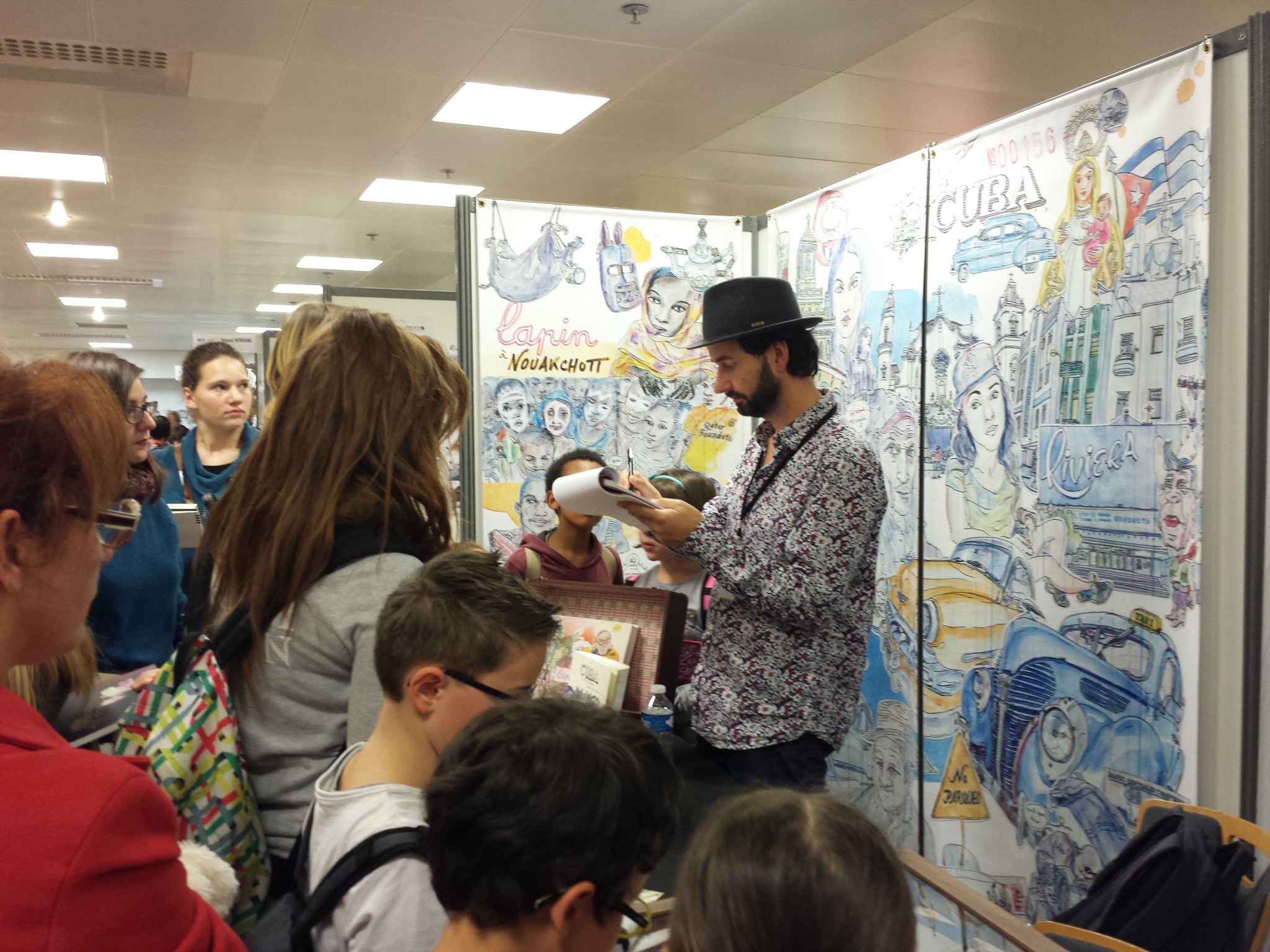 C’est accompagnée de Val que j’ai attaqué ce premier jour à Polydome. S’il y a une chose à savoir, c’est que c’est le jour des scolaires et qu’il ne faut pas espérer obtenir de dédicace auprès des artistes car la file d’attente est longue et pleine d’enfants ou d’ados impatients de faire gribouiller leur cahier. Bref.