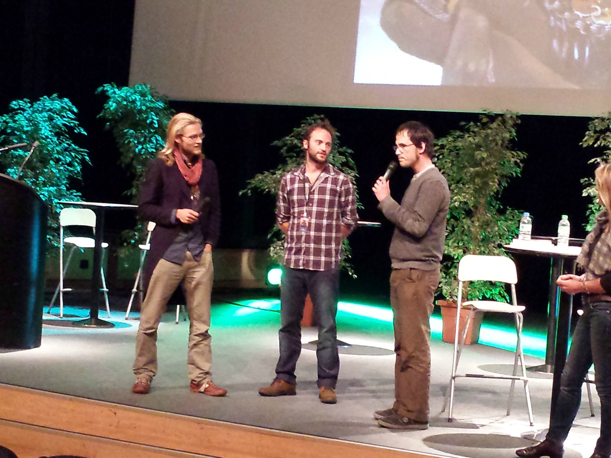 A 15h, j’avais rendez-vous (enfin, façon de parler) avec Nans et Mouts, les deux types qui se promènent à poil sur France 5. « Nus et culottés » est une émission insolite, conduite par ces deux jeunes baroudeurs qui décident de partir à poil, au sens propre comme au sens figuré, à la rencontre des habitants d’une région. Ils se fixent un objectif, qu’ils devront atteindre grâce à la solidarité des gens croisés sur leur chemin : vêtements, endroit pour dormir, auto-stop… des péripéties qui sont autant de prétextes à rencontrer l’Autre, l’apprivoiser, gagner sa confiance et, pourquoi pas, en faire un complice dans leur aventure. Dans l’épisode diffusé lors du festival (et déjà passé à la télé il y a quelques mois), Nans et Mouts voulaient faire de la montgolfière au-dessus des volcans. Ça c’est de l’objectif qui claque ! Malheureusement, même s’ils ont bien fini par monter dans une montgolfière, ce n’était pas en Auvergne. Mais peu importe, le voyage était beau, insolite et jalonné de rencontres étonnantes dont ils sont ressortis nourris, physiquement et spirituellement, et conscients de modes de vie et de partage inconnus d’eux jusqu’alors. Après la diffusion du film, les deux compères se sont prêtés avec bienveillance et beaucoup d’humour au jeu des questions-réponses du public. Je retiendrai ce moment fort et inattendu lorsqu’ils ont aperçu dans la salle un jeune homme qui les avait accueillis lors de l’un de leurs voyages. Leur récit croisé et improvisé sur la façon dont ils avaient vécu leur rencontre inopinée ont été un grand moment d’émotion pour tout le monde et, s’il fallait encore le prouver, le gage de la sincérité de la démarche des « Nus et culottés ». Les prochains épisodes inédits (4 ont été tournés) seront diffusés à partir du printemps 2015.