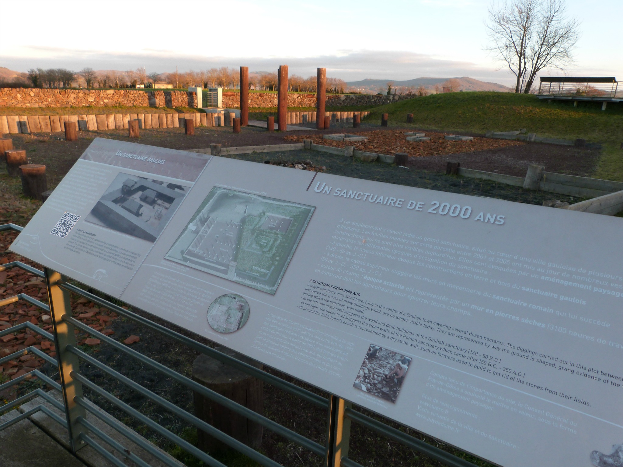 La première partie du circuit offre une vue splendide sur Veyre-Monton et sa vierge blanche monumentale, ainsi que sur la chaîne des Puys. La balade se poursuit au travers du petit village de Soulasse, accroché au flanc du puy de Corent et bien pentu. Puis l’ascension vers le sommet du plateau offre une vue côté sud, vers le Sancy, avant de mener le regard vers le val d’Allier. La dernière partie de la randonnée amène enfin les visiteurs à l’oppidum. Un chantier de fouilles en activité est interdit au public mais quelques mètres plus loin, les bases de l’oppidum ont été reconstituées afin de donner une idée de ce à quoi ça pouvait ressembler. Des petites panneaux informatifs nous désignent des habitats aristocratiques ou des théâtres là où aujourd’hui s’étendent des parcelles cultivées. Il faut faire un petit effort d’imagination mais quand on a devant soi la chaîne des Puys dans le soleil couchant… c’est un peu difficile ! Pour ceux que ça intéresse, une petite vidéo de reconstitution en 3D est disponible sur le site du Conseil général du Puy-de-Dôme. La redescente vers le village de Corent se fait avec une vue imprenable sur le val d’Allier, Longues et le puy Saint-Romain.