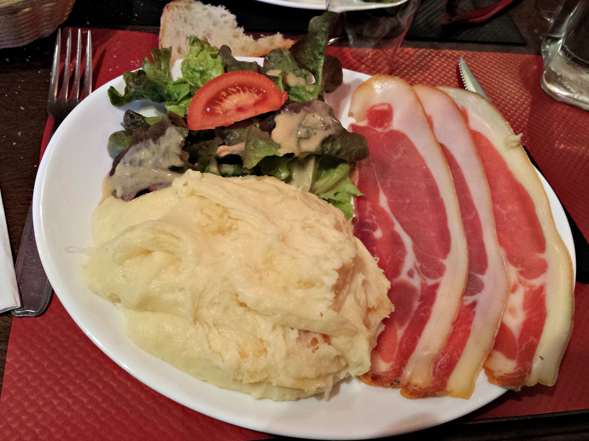 A notre arrivée certains stands  plient déjà les gaules. Les rues sont moins encombrées que je le craignais et c’est sûrement parce que la plupart des visiteurs sont attablés pour le grand repas à la salle polyvalente. Nous prenons un vin chaud et j’avoue que ça faisait bien longtemps que je n’en avais pas bu de si bon. A 2,50€ le grand gobelet, le dé à coudre de piquette du Marché de Noël de Clermont à 1€ peut aller se rhabiller. Les restaurants sont tous pris d’assaut, certains annoncent complet jusqu’à 15h30 mais nous trouvons une table au Bar de la Gayme. Accueil souriant, sympa et rapide malgré l’affluence et le chahut de petits groupes déjà bien éméchés. Je craque pour un aligot tandis que JD s’offre une andouillette. Les calories de la truffade perdues pendant la randonnée sont aussitôt reprises. Grumpf !