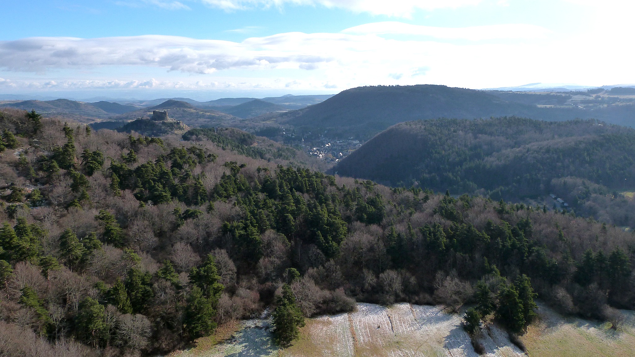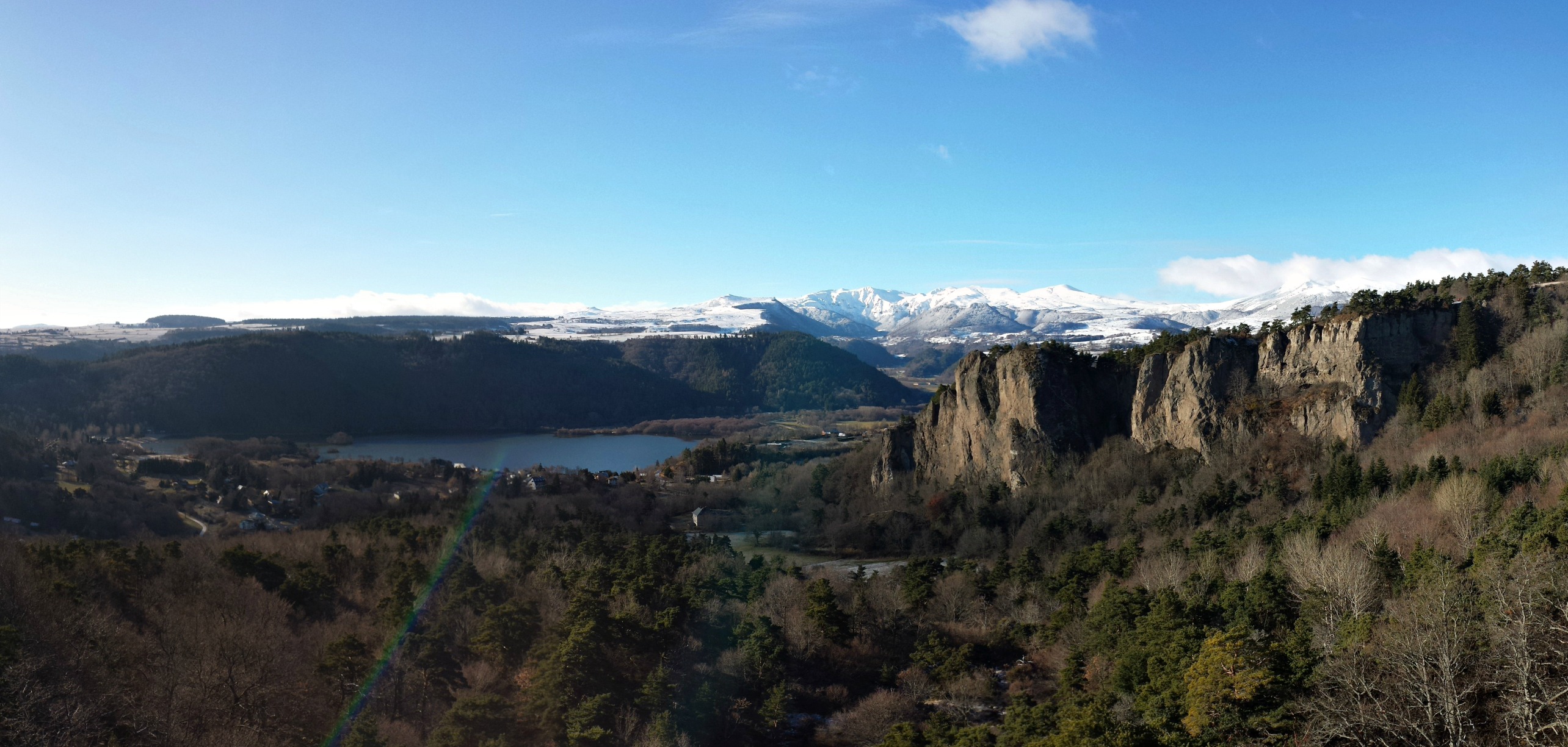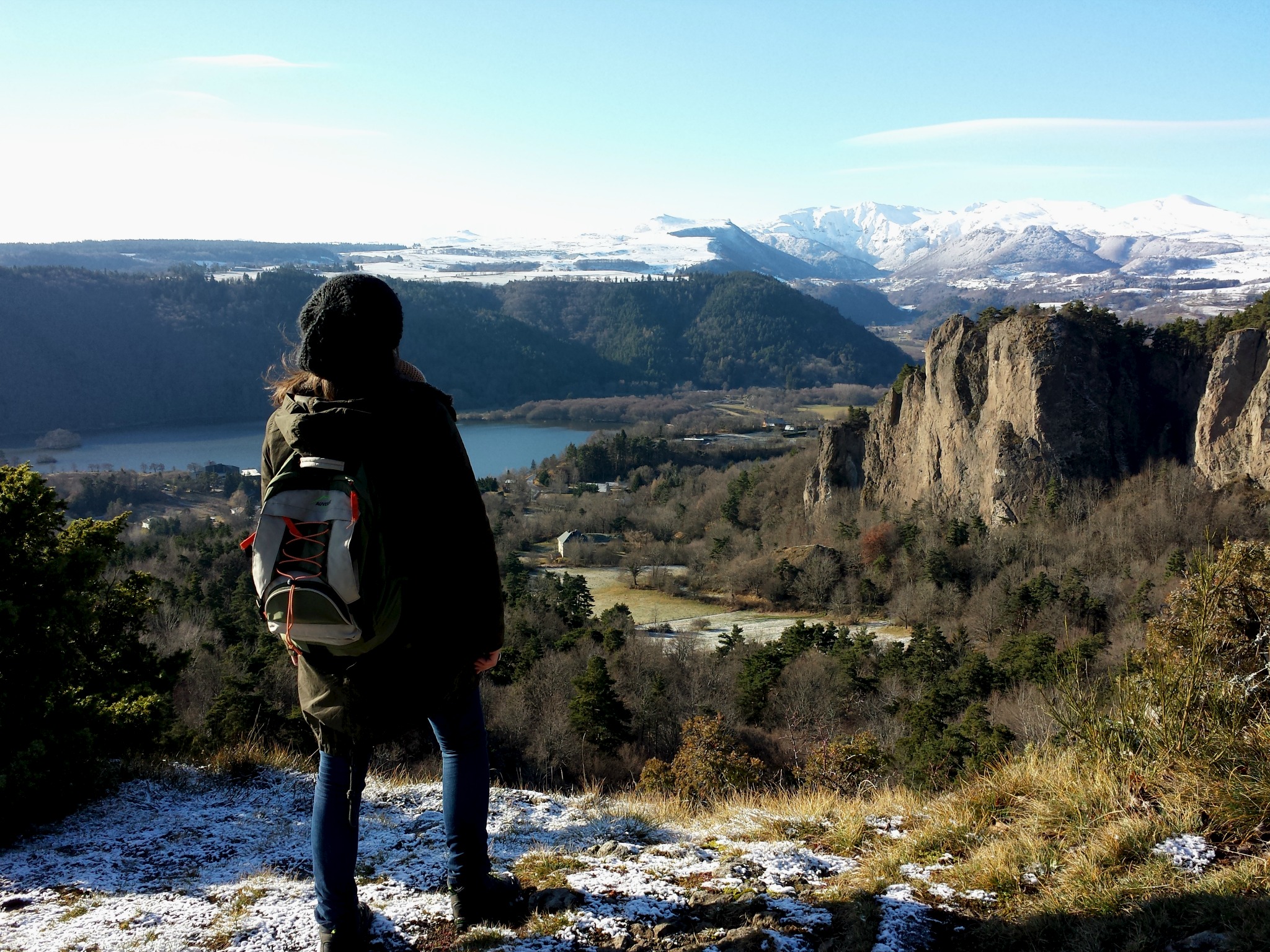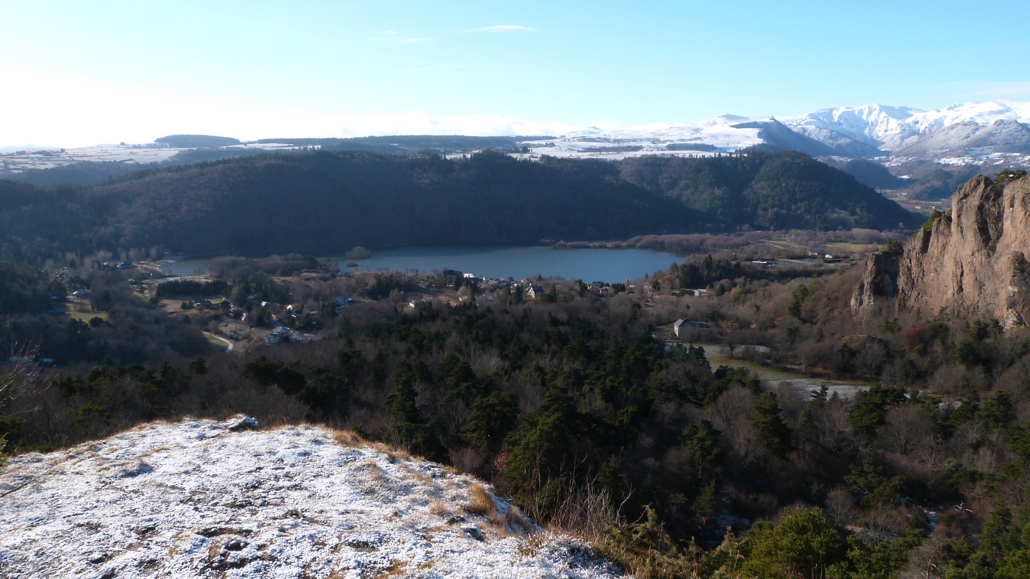 Peu de neige sur le parcours, un sol partiellement gelé qui nous épargne la gadoue, un beau soleil qui nous réchauffe… des conditions idéales pour randonner. La montée se fait sans encombre et le premier panorama qui s’offre à nous est tout simplement stupéfiant de beauté. En bas, le lac Chambon, entouré de volcans et notamment du Tartaret. En face, les falaises impressionnantes de la Dent du Marais. A l’horizon, le massif du Sancy, tout blanc et éclatant dans le soleil du matin. Et derrière nous, le château de Murol campé sur son rocher et surplombant un paysage bosselé de volcans millénaires. Difficile de savoir où poser le regard dans cet ensemble fascinant et difficile de s’arracher à ce spectacle pour continuer la balade.