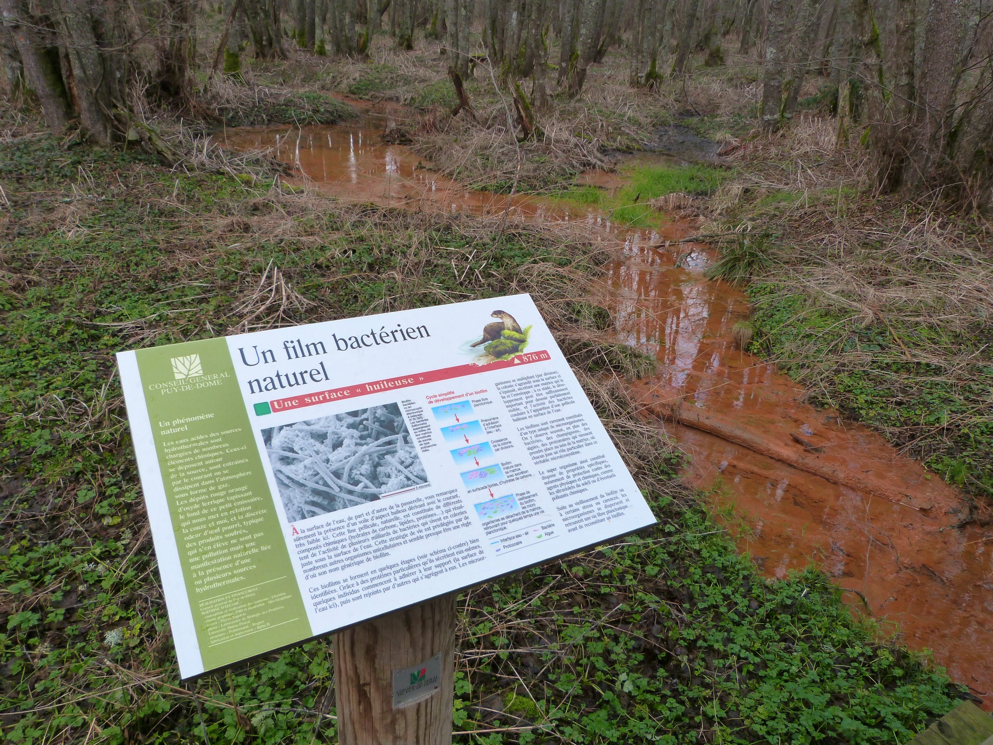 Elle se poursuit pourtant le long de la falaise, et de la Dent du Marais, avant de redescendre vers le lac. Notre guide proposait d’en faire le tour, en passant notamment par les pontons aménagés au-dessus la zone humide. Cette partie est certes très intéressante et jalonnée d’explications sur le milieu et sa faune mais ce doit être beaucoup plus sympa à faire l’été, avec une végétation qui ne soit pas en sommeil. Sans compter que le soleil nous a quelque peu lâchés en arrivant au Chambon.