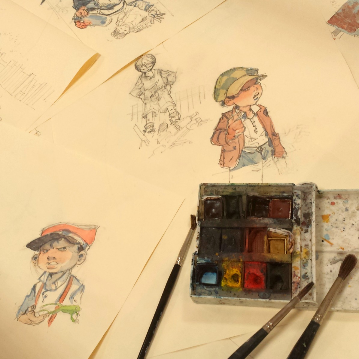 Les Editions Margot ouvrent leurs portes sur un univers tout à fait singulier. Sur chaque album souffle un vent de poésie, de nostalgie, de douce mélancolie surannée. Personnages solitaires, un peu perchés, au sens propre comme au figuré, enfants paumés ou adultes rêveurs, inspirés de Brel ou de Brassens… Je crois que cette exposition m’a donné envie de tout lire. J’ai déjà chez moi « Poulbots » de Patrick Prugne, sorti il y a quelques semaines. Je pense que mes prochains achats seront pour « Ici reposent tous les oiseaux » de Etienne Friess et Anne-Fleur Drillon et pour les recueils Brel et Brassens, en attendant les petits chats malicieux de Benjamin Lacombe.