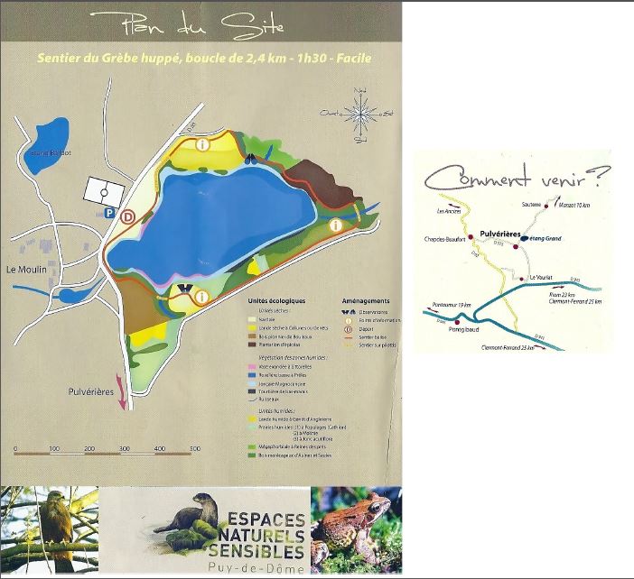 L’étang de Pulvérières se situe à environ 30 mn au nord-ouest de Clermont et est classé ENS (Espace naturel sensible). Un sentier aménagé lance les visiteurs sur la trace du grèbe huppé et de toutes sortes d’oiseaux et mammifères… qu’il est évidemment particulièrement difficile à observer. Comme d’hab. Peu importe.