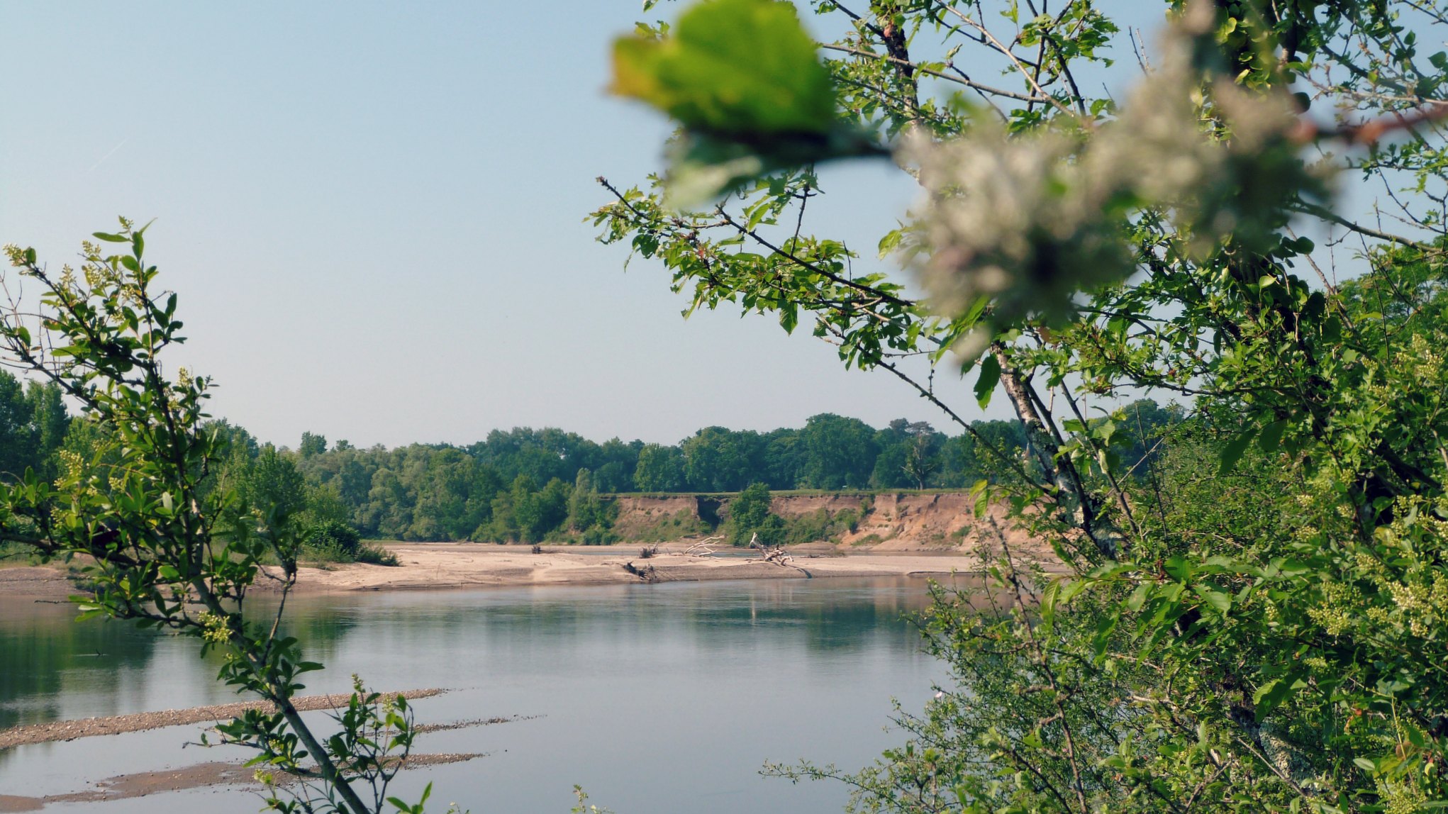 Bref, c’est parti pour la balade. Qui commence plutôt bien, le long d’un champ de coquelicots. Ensuite deuxième erreur, nous sommes passés directement du 2 au 4 (cf. carte LPO). Le 3 conduisait à des falaises que nous avons aperçues de loin par la suite. Mais à partir du 2, on aurait dû se méfier… Après avoir passé une grande barrière flanquée du panneau officiel de la réserve, nous avons constaté que les chemins étaient… en vrac. Recouverts par la végétation, luxuriante, ils étaient parfois à peine visibles. Sans compter les bifurcations piégeuses, nous obligeant à dégainer Google Maps pour s’assurer de la bonne direction. A aucun moment le sentier n’est balisé ou fléché. Vous voilà prévenus. Alors certes, il y a des oiseaux, on les entend bien. Il y a aussi des chenilles qui pendent des arbres au milieu du chemin, des branches à hauteur de tête, des plantes envahissantes au milieu du sentier… mais bon, c’est la nature hein ! Finalement, le sentier débouche sur le méandre et ses bancs de sable. On peut enfin souffler et profiter du panorama. Notez que là encore, Google Maps est piégeux car il matérialise un méandre à traverser alors que nous avons toujours eu les pieds au sec avant d’arriver là. Mais j’imagine qu’en fonction des crues, la physionomie de l’Allier doit changer d’une saison à l’autre.