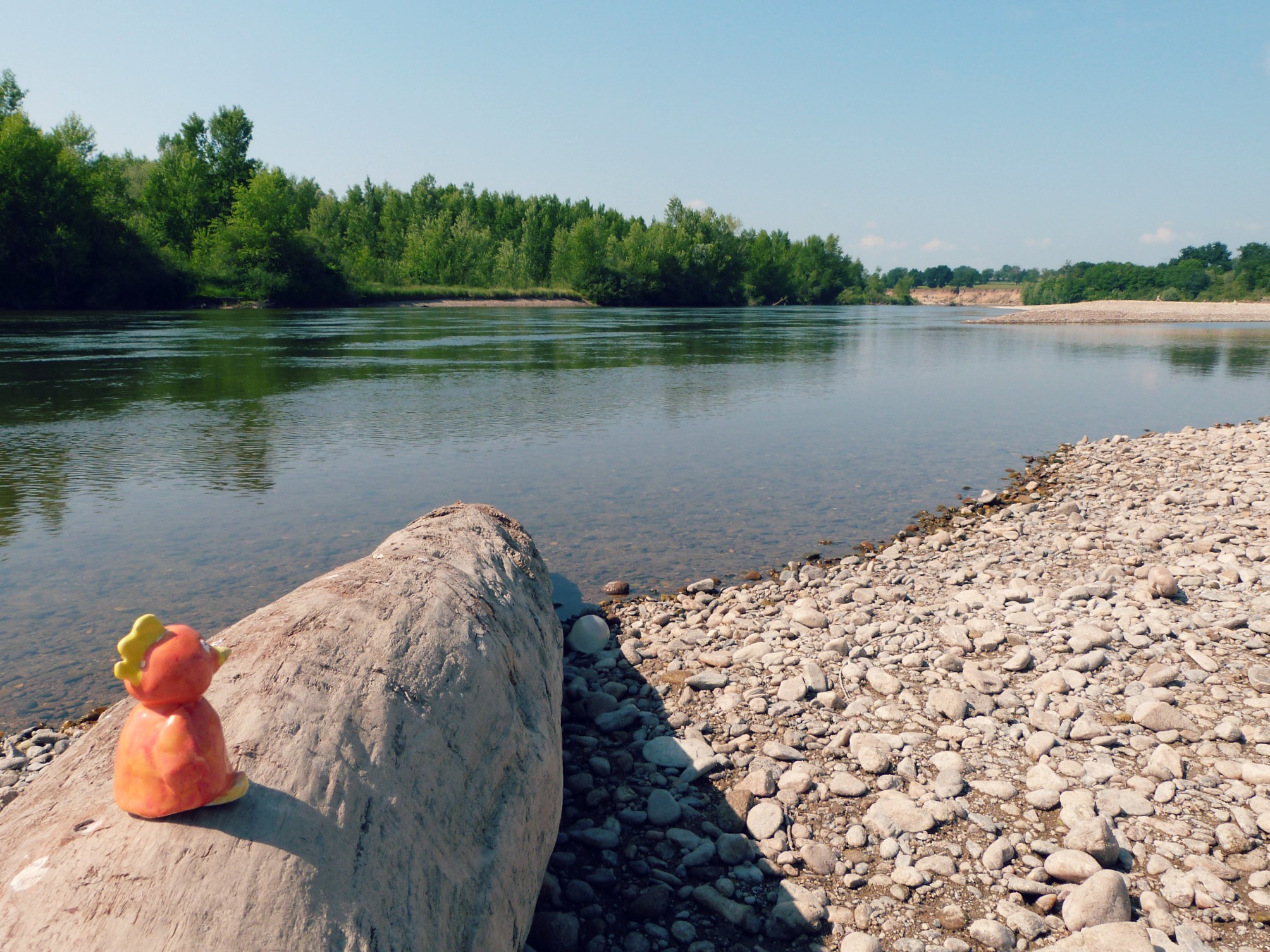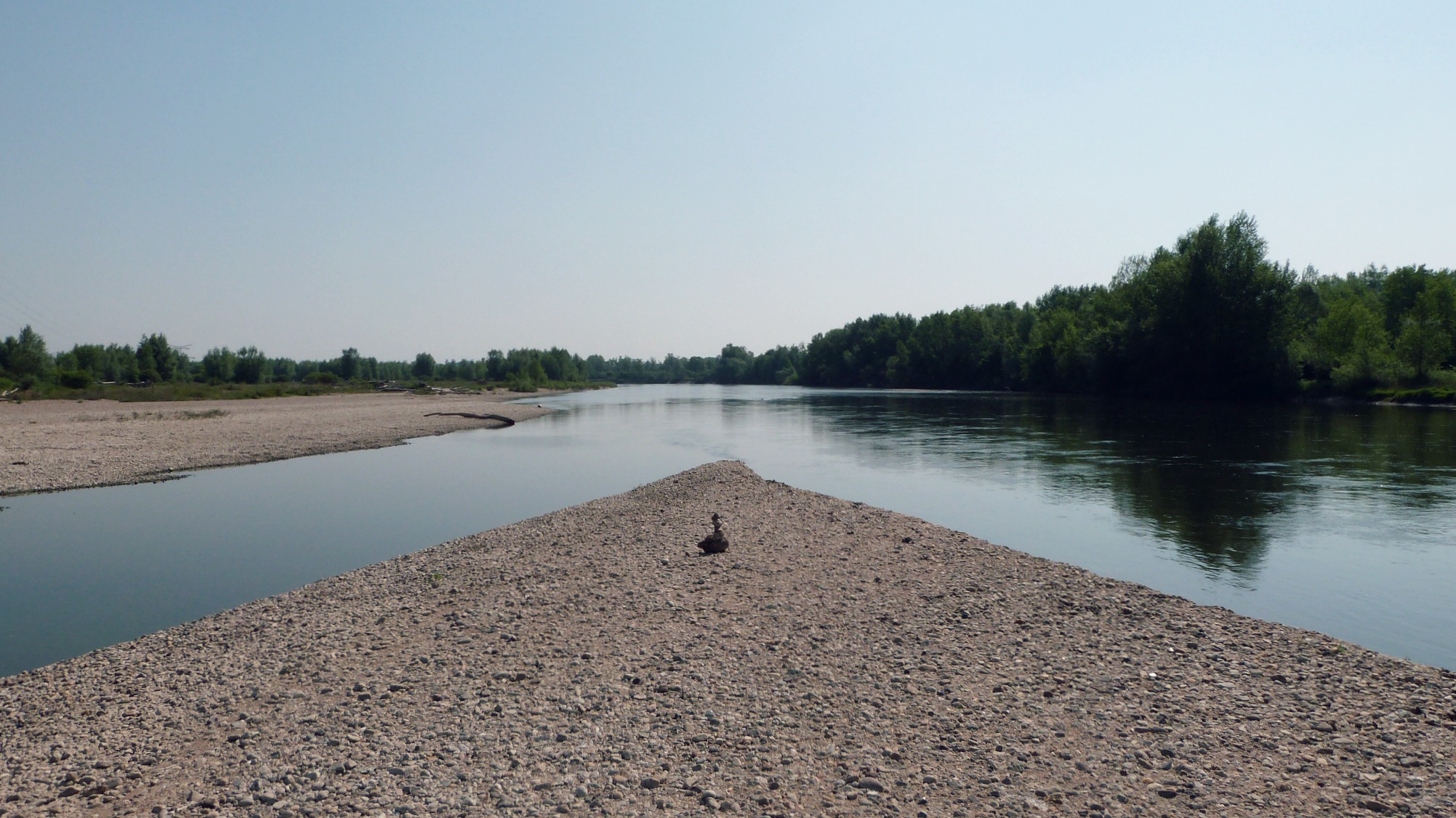 Bref, le tour du méandre à découvert, c’est plutôt sympa si on fait abstraction de la ligne à haute tension qui passe juste au-dessus. Bois flotté, galets de sédiments, empreintes palmées au sol…