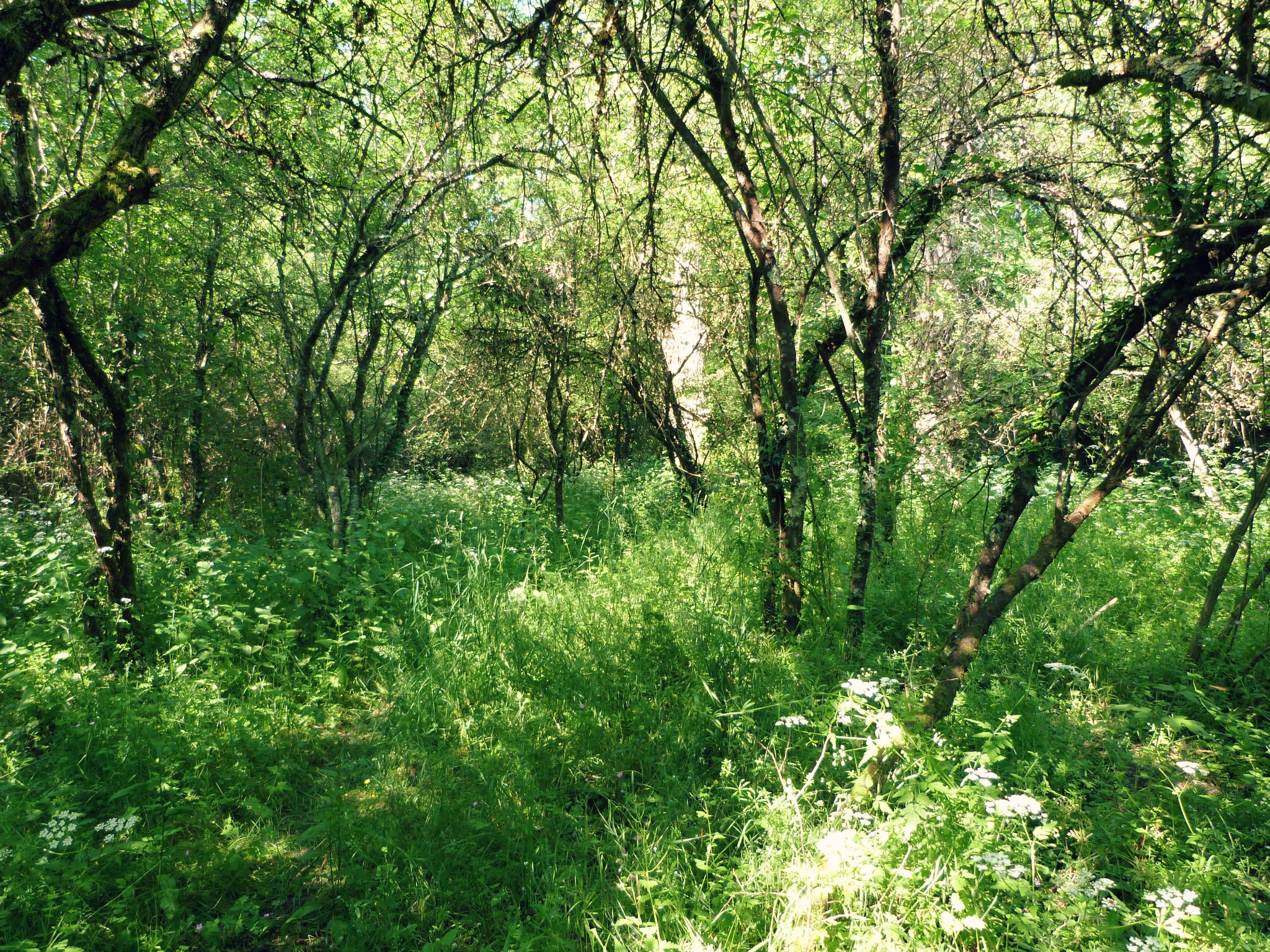 Après, c’est le bordel. Impossible de retrouver le sentier, qui se perd dans les bois et les herbes hautes. Nous avons aperçu un troupeau de vaches mais avons évité d’aller à leur rencontre. Et c’est là qu’on s’est retrouvés nez à nez avec le méandre. A traverser. Car techniquement la voiture était à 100 m à vol d’oiseau et nous n’avions aucune envie de divaguer plus longtemps dans cette brousse. Il était près de midi et étions attendus à Saulcet pour un pique-nique chez un vigneron. Heureusement le niveau d’eau était faible et la largeur d’un peu plus d’un mètre. Easy. Ensuite re-pris au piège par le méandre, nous avons eu la chance de tomber sur un chemin forestier à l’abandon, mais aménagé de rondins de bois, qui nous a ramenés très exactement devant la voiture. Mais pile devant. Le soulagement total.