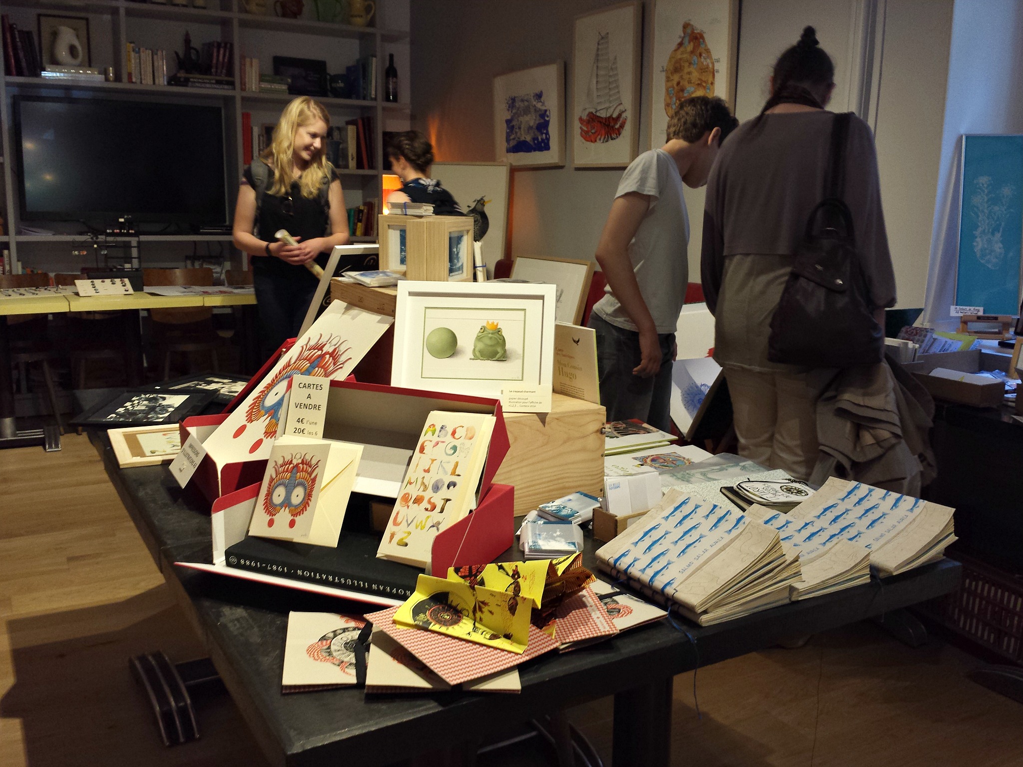 Dans cette boutique c’est l’expo permanente. Je ne peux que vous encourager à y entrer tout au long de l’année pour faire l’acquisition d’objets de papeterie faits à la main. A l’occasion des Arts en balade, on peut ressortir avec une carte imprimée sous nos yeux ébaubis, façon Gutenberg avec les petites lettres en plomb qui vont bien. Notez les superbes affiches pour les amoureux de Clermont (je vais finir par craquer) et pour les Arts en balade, des pages d’atlas du XVIIe siècle ont été découpées, collées, réorganisées pour être beaucoup plus funky.