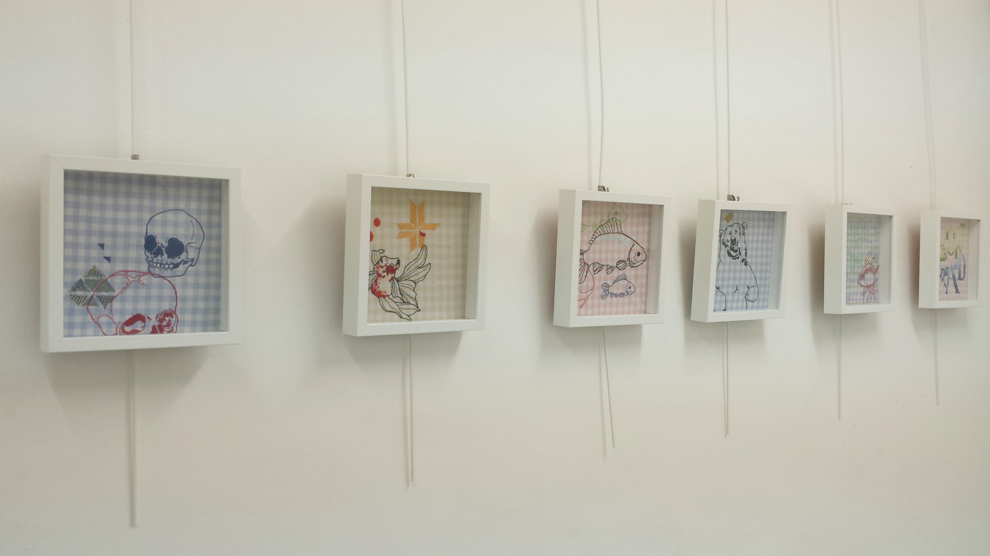 Le Local 19 abrite bien du beau monde (clique et regarde-moi toutes ces têtes de vainqueurs) ! Espace de co-working, il accueille aussi bien des photographes que des professionnels du web. Bien sûr pour les Arts en balade, priorité aux artistes mais ça ne m’empêchera pas de parler de Blablalivre : porté par Pierre Gambaud, ce site propose de donner son avis sur un bouquin… en 140 caractères, soit l’équivalent d’un tweet. Finies les critiques-fleuves, en deux lignes on sait de quoi il retourne et si ça vaut le coup où pas. Évidemment, plus il y a de gens qui donnent leur avis, mieux c’est, je vous invite donc à laisser quelques bons conseils. Pour vous remercier vous pourrez prendre un marque-page au Local 19 :)  Bon et niveau expos alors ? Et bien au rez-de-chaussée, c’est Sophie Navas qui expose ses dessins et broderies. Sophie je vous en avais déjà parlé pour les Arts en balade mais aussi pour le sketchcrawl clermontois auquel j’avais participé. Une finesse de trait qui donne naissance à un bestiaire fantastique dont on voudrait bien entendre l’histoire qui va avec (ça me fait toujours penser à un bouquin de mon enfance dont je ne peux me rappeler le nom). Et cette année, des broderies sur des toiles Vichy avec toujours des animaux (et quelques têtes de mort). Dans la pièce d’à côté, c’est Fanny Reynaud qui expose ses carpes. Je dois dire que j’étais plutôt contente de les voir en vrai. Enfin j’me comprends, pas des vraies carpes, mais à taille d’expo quoi, pas sur l’écran de mon PC pourri. J’avais déjà repéré ces clichés sur le blog de Fanny (là, la preuve, j’avais commenté), depuis mon commentaire je suis allée au temple du Bost mais je n’ai pas vu les carpes de cette façon… A l’étage du Local 19, Nicolas Roger revient avec une nouvelle série à base de reflets, mais beaucoup moins abstraite que celle de l’an dernier. Objets du quotidien, animaux (pauvre chat !) ou personnages… ce sont les repères qui sont plongés dans le flou, dans une approximation déconcertante bien que convaincus de la réalité de la scène. Je tiens au passage à souligner l’excellent travail de l’Atelier Baryté, qui a effectué les tirages de Fanny et de Nicolas. Aux côtés de Nicolas, c’est Cindy Pibeaud qui expose de drôles de créations : une tête difforme, une main, un costume de peau… âmes sensibles rassurez-vous, il ne s’agit que d’artifices, fort bien réalisés et plus vrais que nature.