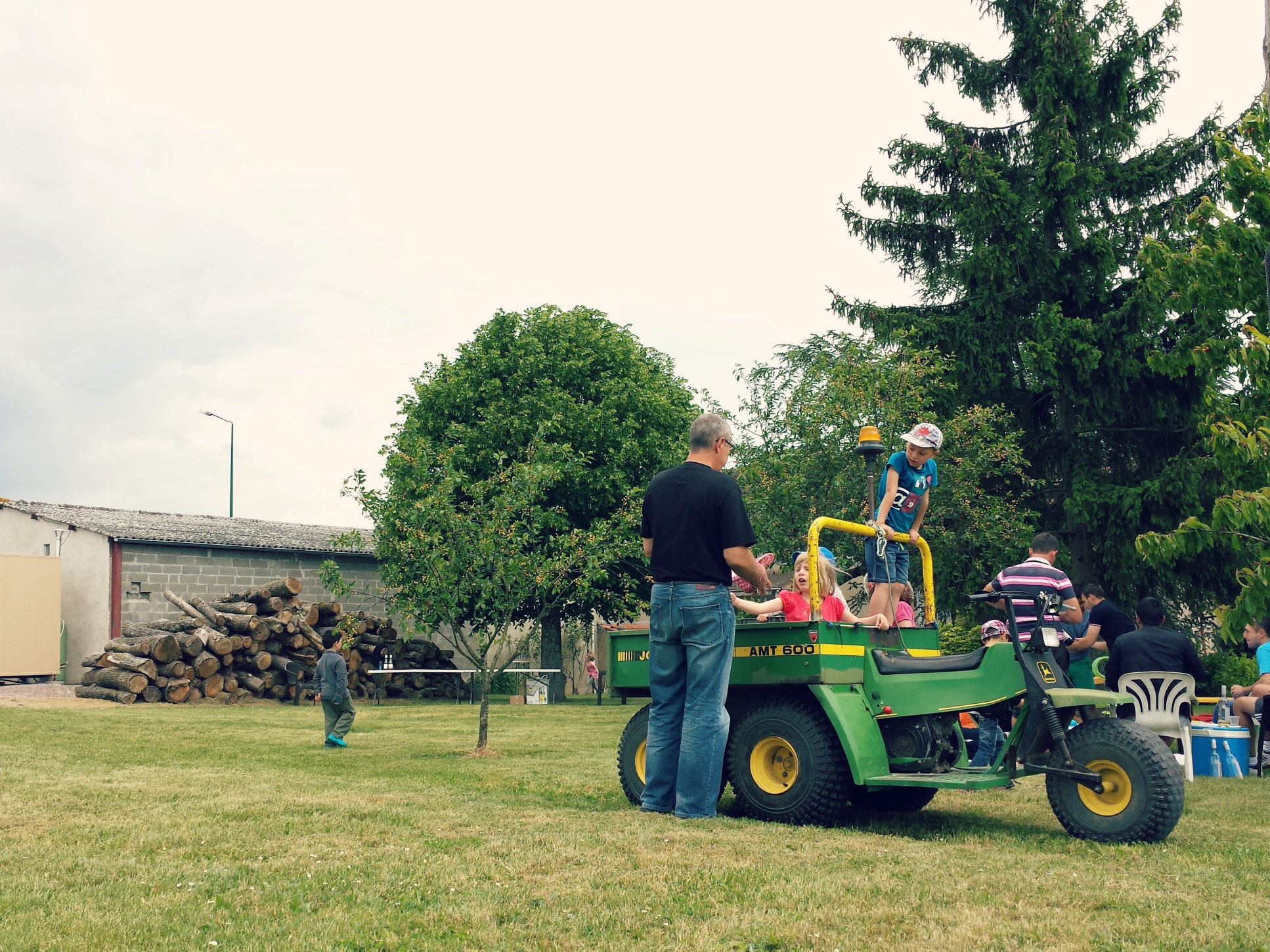 Je retiendrai de cet après-midi le bel et généreux accueil de la famille Ray, le transport de la mamie et des enfants dans la remorque, les chiens qui gambadent, la sieste sur le gazon, un peu pompette.