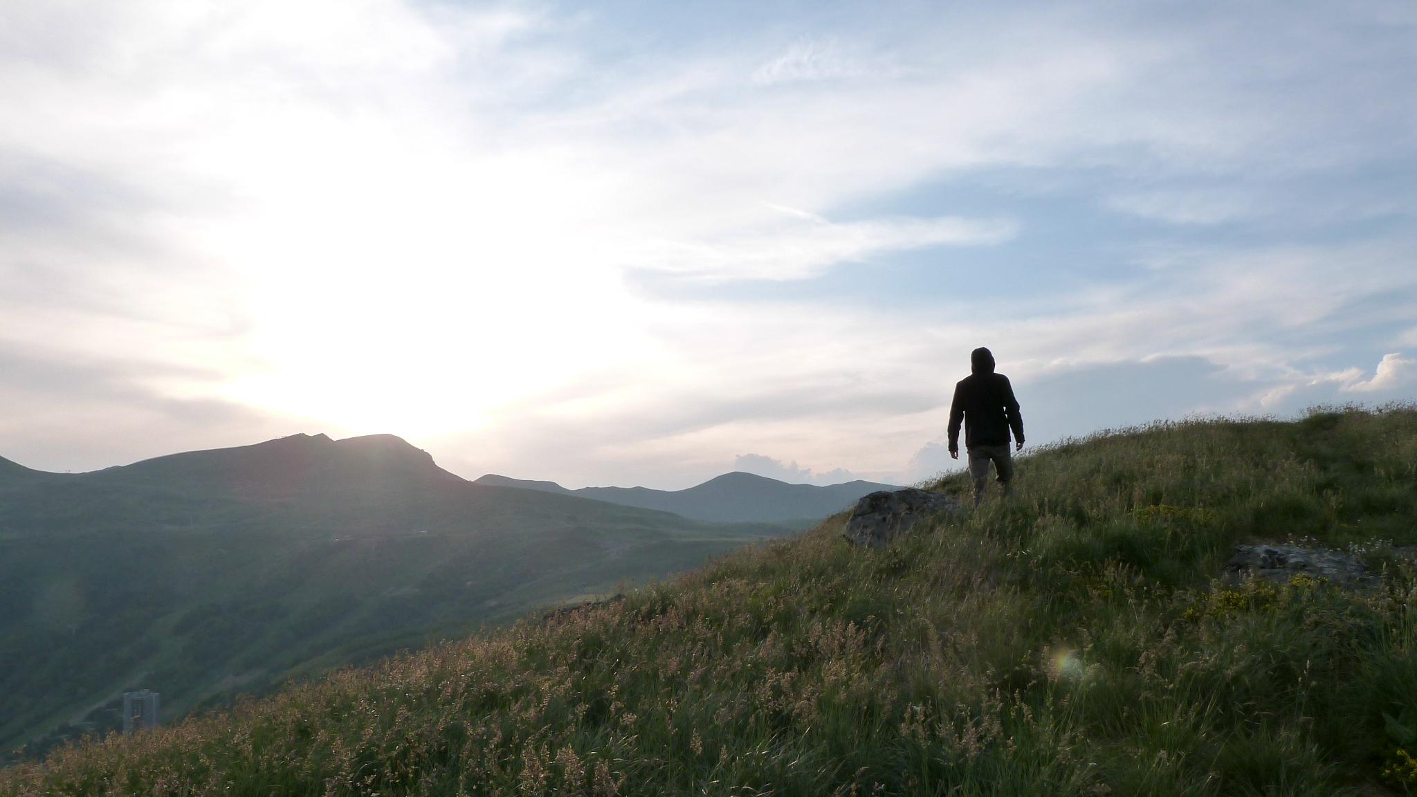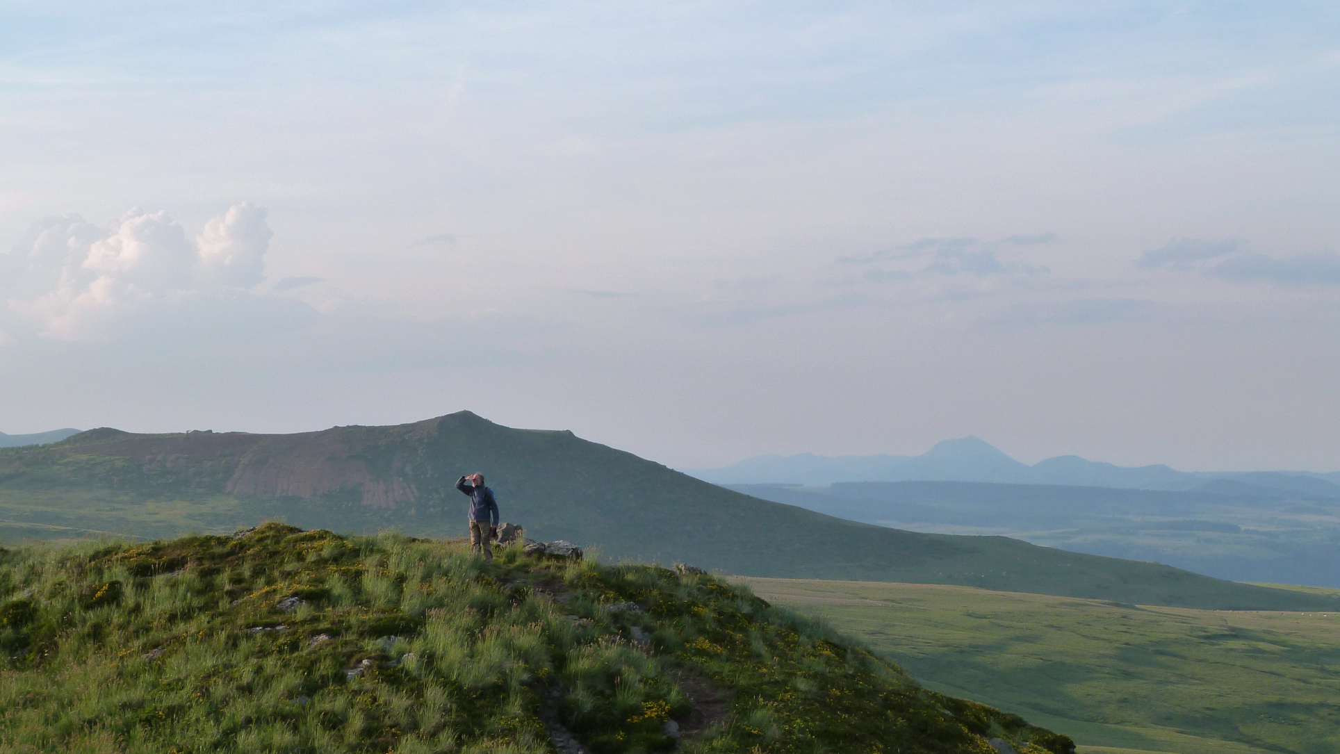 Retour vers Super-Besse dans le soleil déjà couchant. Les visiteurs sont invités soit à rejoindre leur véhicule pour repartir chez eux (il est 20h), soit à se lancer dans une dernière petite randonnée bien raide, sur les pentes du puy du Chambourguet, afin de voir la dernière oeuvre du programme. C’était l’oeuvre que j’appréhendais le plus, de par sa symbolique morbide, et finalement, j’ai été agréablement surprise. L’ascension du puy est difficile et probablement épuisante en plein soleil de l’après-midi, mais la récompense est à hauteur des efforts fournis. De là-haut le regard porte loin, sur la chaîne des Puys, sur le Sancy, sur le Pavin… Et au creux du cratère… un avion gît, éventré. Faire le tour du cratère, descendre dedans et pénétrer dans la carcasse… on se sent un peu explorateur, au bout du monde. L’oeuvre est éclairée de nuit (en rouge), des photos sont visibles sur le site de l’artiste et ça donne envie de recommencer cette petite randonnée à la nuit tombée. Il n’aurait fallu attendre que quelques minutes peut-être pour voir les lueurs rougeoyantes mais il est déjà tard, la redescente s’effectue sous les derniers rayons du soleil, le fond de l’air est frais et au moment de rejoindre la voiture il est déjà 21h15.