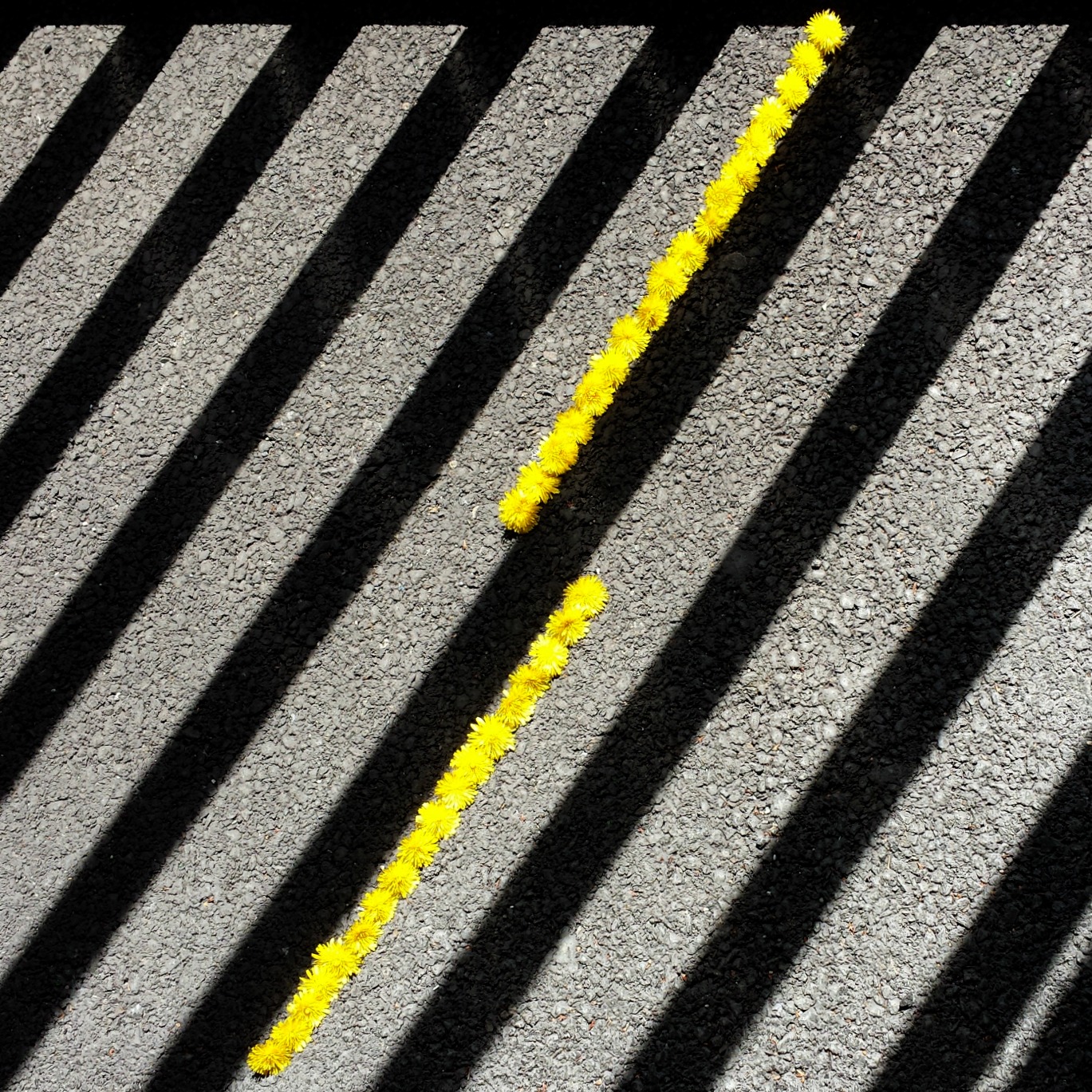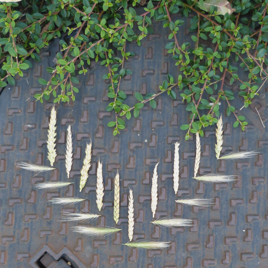 Il fallait pour cet atelier apporter un peu de « matériel » glané à l’avance. Venue à l’arrache, je m’étais arrêtée à côté du cimetière de Crouël pour faire mon marché. Je connais le spot pour passer devant tous les jours quand je vais au boulot donc dans ma besace : coquelicots, épis de blé et quelques herbes folles. Cependant, il y avait sur place de quoi faire quelques oeuvres et je remercie les pissenlits pour cette création réalisée derrière les grilles du parking du personnel. Jouer avec l’ombre n’est pas chose facile, on a à peine posé ses fleurs qu’il faut recommencer car l’ombre a tourné. C’est le jeu. Vite vite ! Les photos !! Et on recommence avec les coquelicots ou les épis de blés. J’avoue que je n’ai pas spécialement pris le temps d’aller voir les créations des autres participants. Sauf celles de Val, qui était positionnée dans le même secteur que moi. Mais j’ai vu en partant que l’inspiration avait été au rendez-vous pour tout le monde.