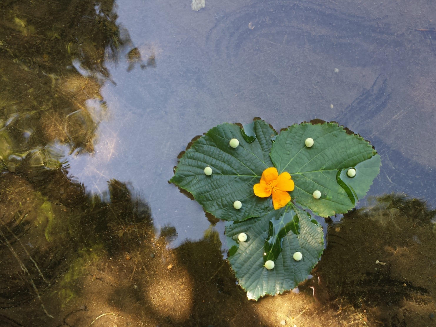 Deuxième atelier la semaine suivante à la médiathèque Jacques-Prévert à Lempdes. Et c’est reparti pour une troisième présentation du travail de Marc Pouyet ;) Cette fois-ci, pas de consigne d’apporter ses propres végétaux donc tout le petit groupe a arpenté le parc de la mairie pour y glaner de quoi faire un chef-d’oeuvre. Je me suis tournée rapidement vers les tilleuls, leurs fruits et leurs feuilles. J’ai eu du mal à trouver un support pour mes « oeuvres », j’avoue que finalement je suis plus à l’aise dans un environnement plus urbain. Un petit bassin a toutefois accueilli un modeste radeau de tilleul et d’escholtzia (merci Google hein ! J’ai toujours prononcé ce nom sans avoir la moindre idée de son orthographe… « escolsia » c’était bien aussi non ? (et je découvre aussi ses propriétés médicinales insoupçonnées au passage)) mais moi ce que je voulais c’est utiliser les poteaux des lampadaires. C’est terrible d’avoir une idée en tête et de ne pas en démordre. Mais je n’ai pas réussi à faire quoi que ce soit de satisfaisant avec les p’tits trous des poteaux…