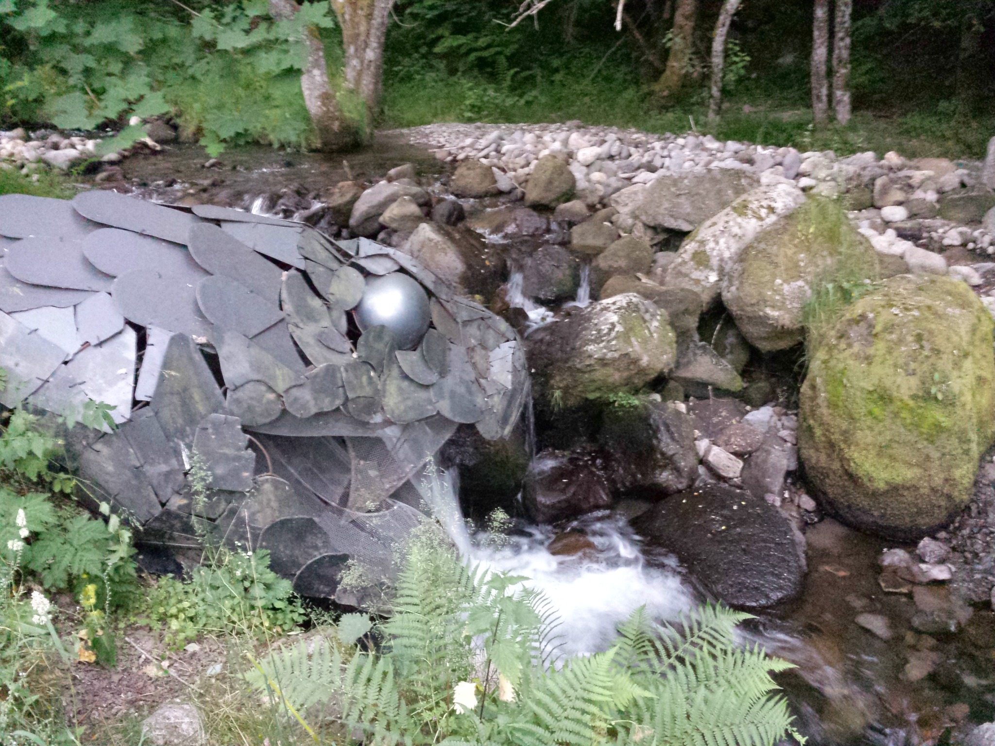 Après ces agapes, autant dire que là, la rando digestive est obligatoire. Ça tombe bien, il n’est pas tard et nous avons encore une belle amplitude de jour devant nous. Nos pas nous amènent finalement sur les traces de la Dordonhia Viperinae de Thomas Monin, oeuvre Horizons rescapée de l’édition 2010 pour une raison que j’ignore (en principe elles sont toutes démontées en septembre/octobre mais j’ai aussi appris récemment qu’une oeuvre 2014 subsistait au Crest et ça tombe bien, je ne l’ai pas vue !). Je suis malheureusement en jupe et sandales compensées mais je survis, à la fois au chemin caillouteux et aux orties recouvrant le sentier menant à la tête de la vipère (qui fait tout de même 70 m de long). Cette dernière est bien amochée par le temps et dévoile ici et là ses entrailles. Il est peut-être temps de lui dire adieu.