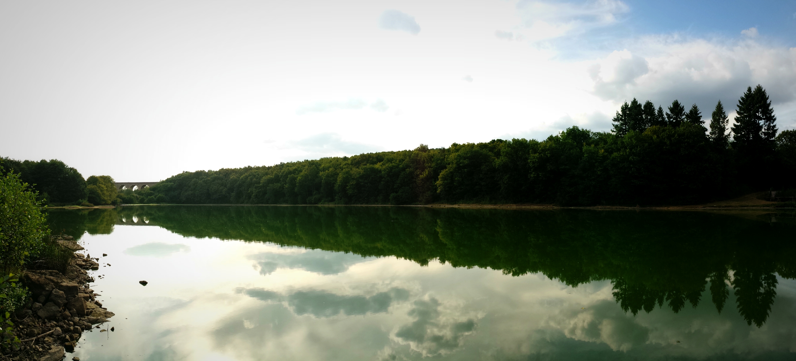 Avant de repartir pour Clermont (par les petites routes, je déteste tellement les autoroutes et j’aime tellement les platanes), j’ai tenu à aller jusqu’au viaduc de Messarges pour le voir en pied. L’étang est joli (mais plein d’algues vertes) et un petit chemin serpente sur la gauche. Ça me faisait bien envie mais il était temps de rentrer, et j’en avais plein les pattes, faut bien l’avouer.