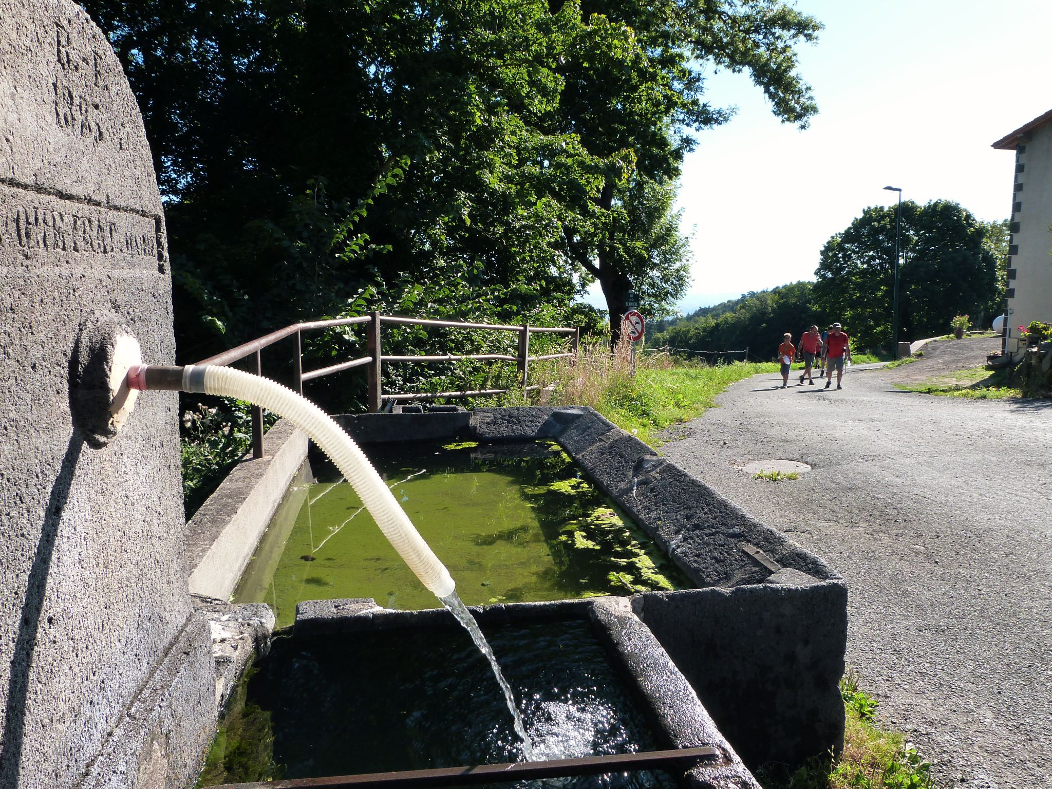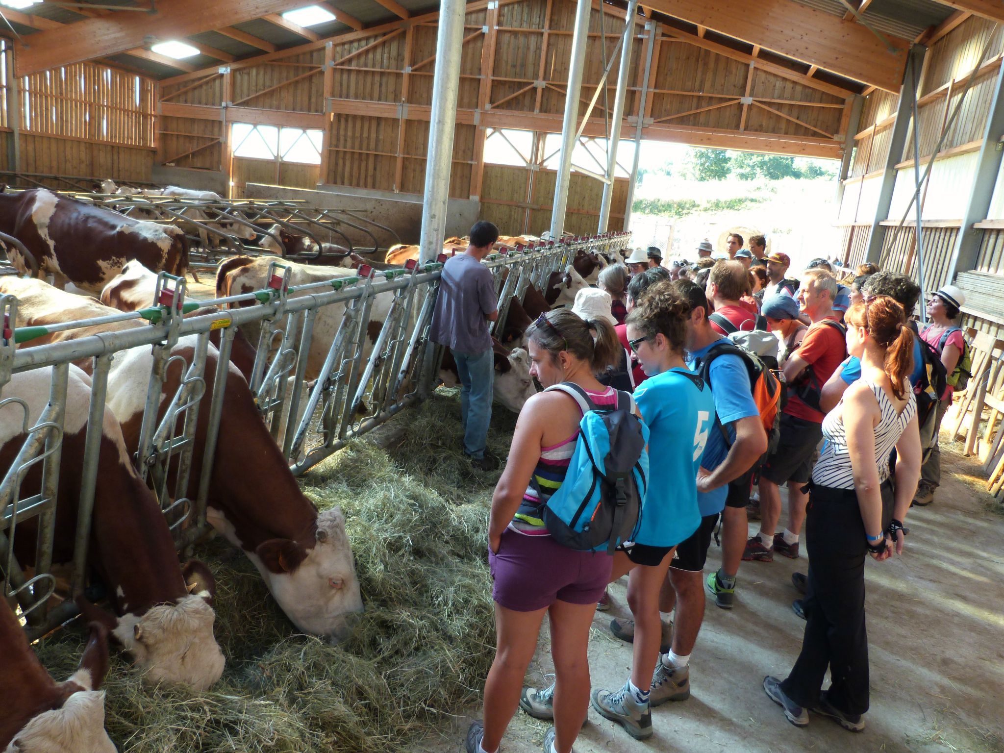 Lorsque nous sortons enfin du bois, c’est pour arriver à Solagnat, première étape culturelle de notre parcours. Je le dis tout de suite, j’ai loupé le four à pain, j’ai juste vu la plaque en lave émaillée sur la façade. Bref. Mais je suis bien allée jusqu’à cette exploitation de vaches laitières où nous attendait le producteur, pour nous expliquer un peu son travail au milieu de ses vaches. Quelques minutes pour partager avec nous les secrets de son activité et il est déjà temps de repartir, il faut encore grimper un peu avant d’atteindre… la route d’accès au puy de Dôme !