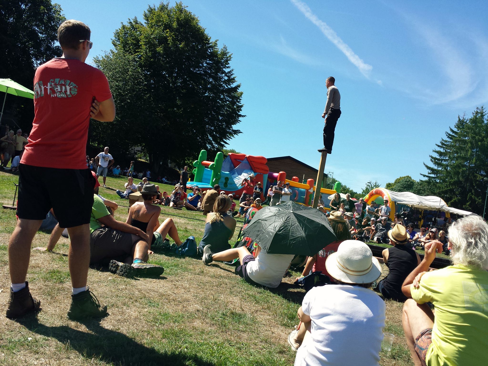 A peine le temps de laisser descendre tout ça dans l’estomac et pas question de sombrer dans une sieste tentante, il faut repartir en coupant à travers le golf des Volcans, que je découvre pour la première fois, assez ébahie par le panorama exceptionnel. J’ignorais qu’on pouvait s’y garer et le traverser pour rejoindre le sentier que nous avons pris ainsi que la gare du Panoramique des Dômes. Nous sommes attendus à Orcines pour le spectacle de la Mondiale Générale. Au milieu de la fête du village, deux acrobates nous offrent un numéro d’équilibriste poétique. Je profite du spectacle tout en gardant un œil bien ouvert sur le stand de brioches de tome, afin de me jeter dessus avant que le groupe ne reparte sur les chemins. La brioche de tome est une spécialité qu’on trouve essentiellement dans le Sancy et sur laquelle il est difficile de mettre la main dans la capitale auvergnate. Elle existe en version traditionnelle sucrée mais aussi salée, avec des lardons, par exemple. Je me charge d’un exemplaire sucré dans mon sac à dos, courageusement décidée à la rapporter chez moi. Bon en fait tout va bien, je sais que le chemin descend maintenant jusqu’à l’arrivée au parc thermal !