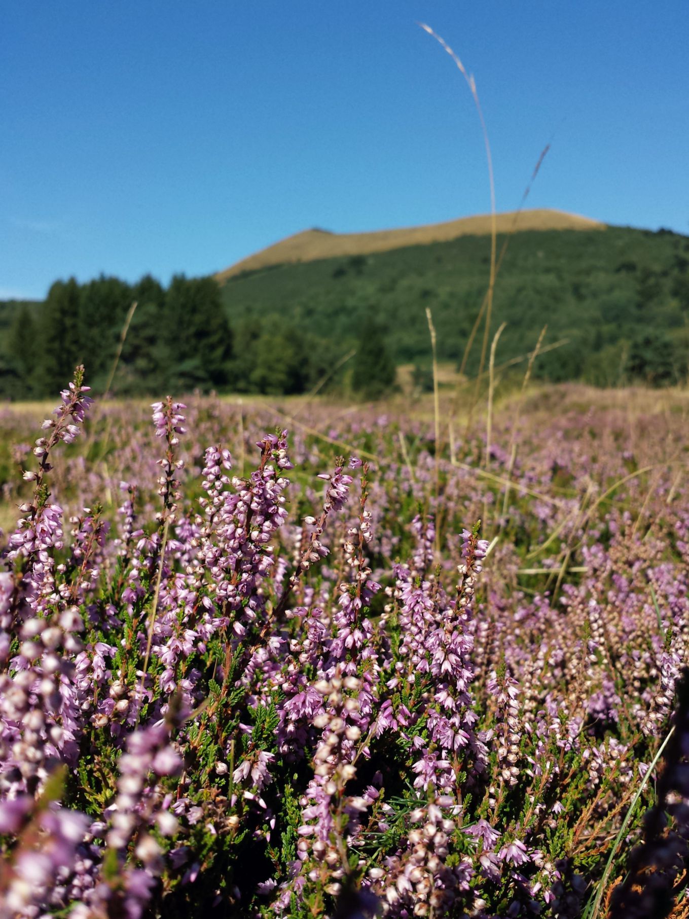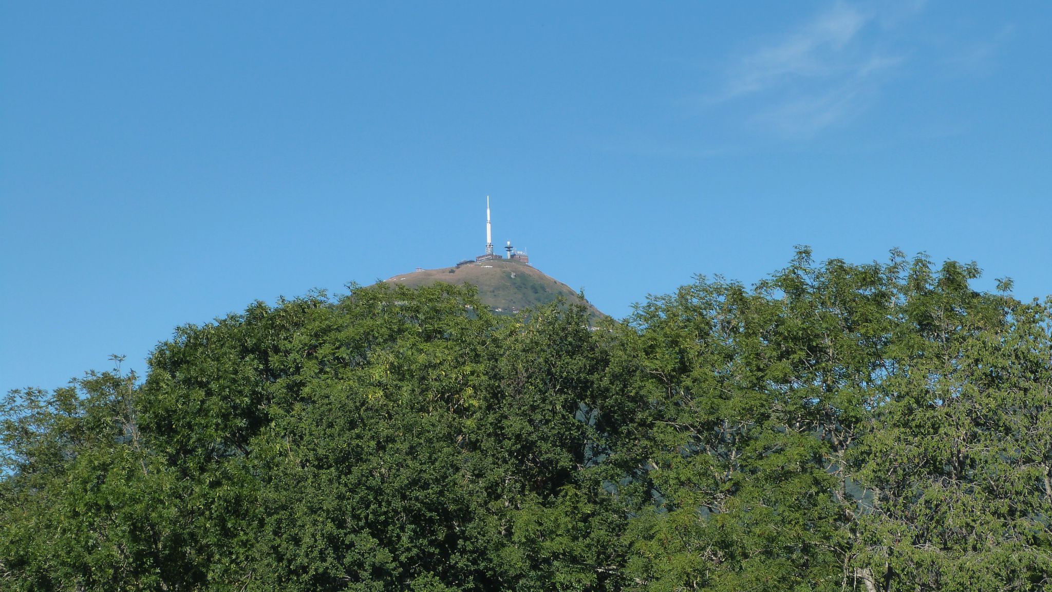 Nous traversons le parking et même les rails du Panoramique des Dômes, pour rejoindre la prochaine étape tant attendue maintenant : le pique-nique ! Car il est déjà midi, il fait chaud et soif. Malheureusement le ravitaillement a pris un peu de retard et nous patientons à l’ombre des arbres. J’en profite pour aller faire quelques photos des deux sommités locales : le puy de Dôme et le puy Pariou, le regard au ras de la callune (nan, je vous l’ai déjà dit, ce n’est PAS de la bruyère, même si nous sommes précisément à Bruyères-des-Moines, d’ailleurs, y a pas de moines non plus, hé !). Notre repas arrive enfin ! Salades de pâtes ou de riz, poulet basquaise chaud, pizza, charcuterie, smoothie melon-roquette, fromages d’Auvergne… de quoi prendre et reprendre plein de forces avec de bons produits locaux. Et puis… le dessert ! Et revoilà Mallorie de l’Armoire à Cuillères avec ses gâteaux addictifs, son smoothie nectarine-figue-raisin à se damner et son sourire inoxydable ! Bonne nouvelle pour les gourmands qui ne font que baver devant les photos depuis maintenant trop longtemps… Ayé !! Elle a trouvé un local ! Ce sera rue des Chaussetiers à Clermont et l’ouverture est prévue début octobre. Ça va se bousculer au portillon, c’est moi qui vous le dis ! Je jouerai des coudes pour vous, ne vous inquiétez pas, et mettrai un point d’honneur à tout goûter afin de vous faire un article le plus objectif et exhaustif possible. Comptez sur moi. Ahem…
