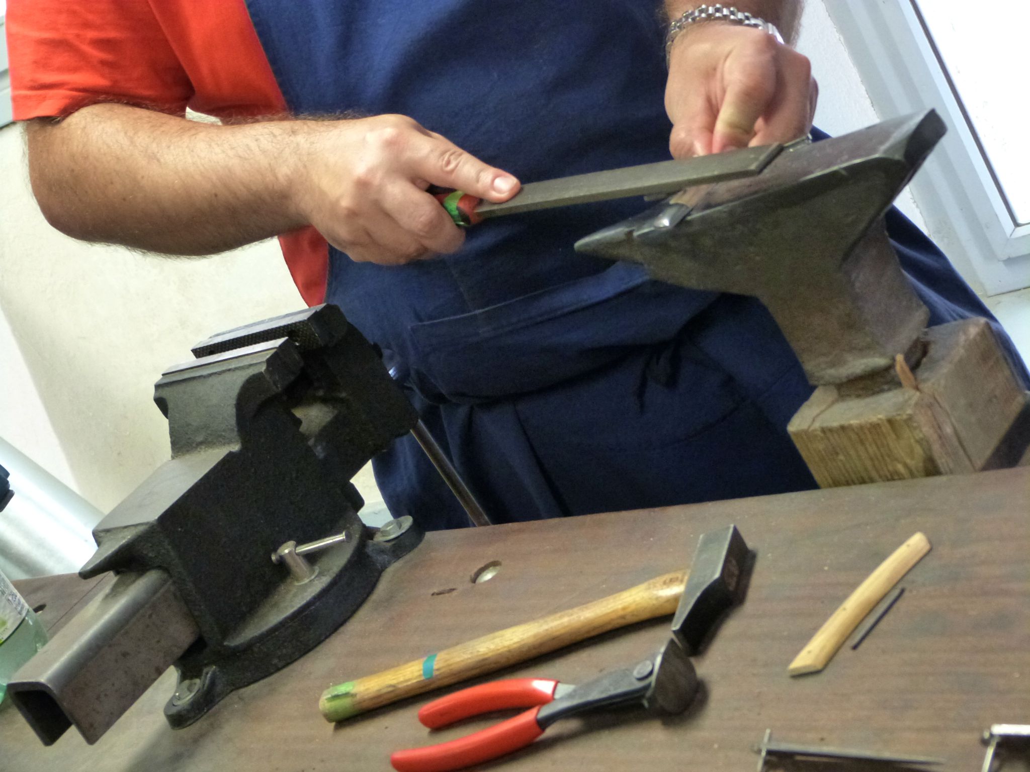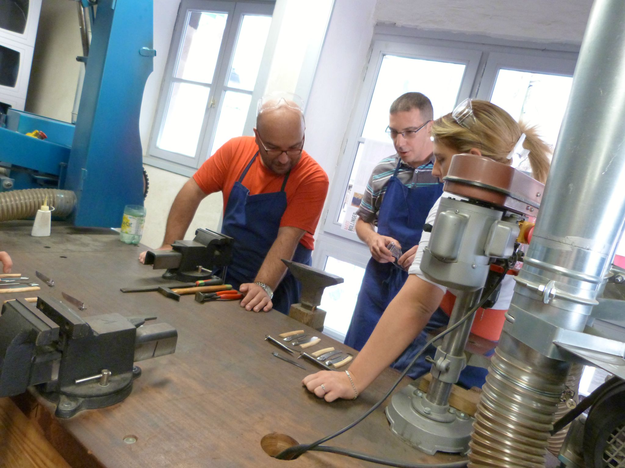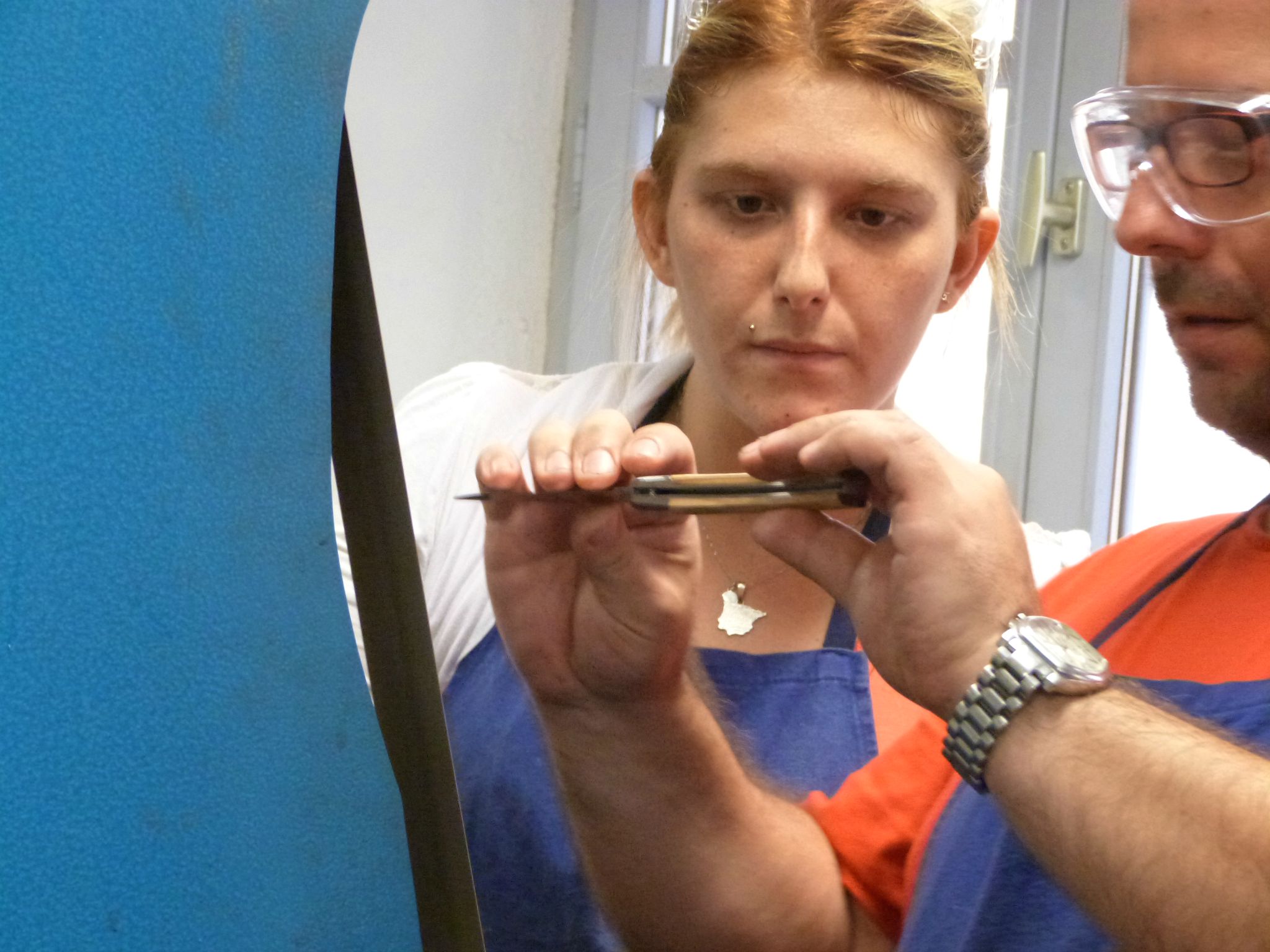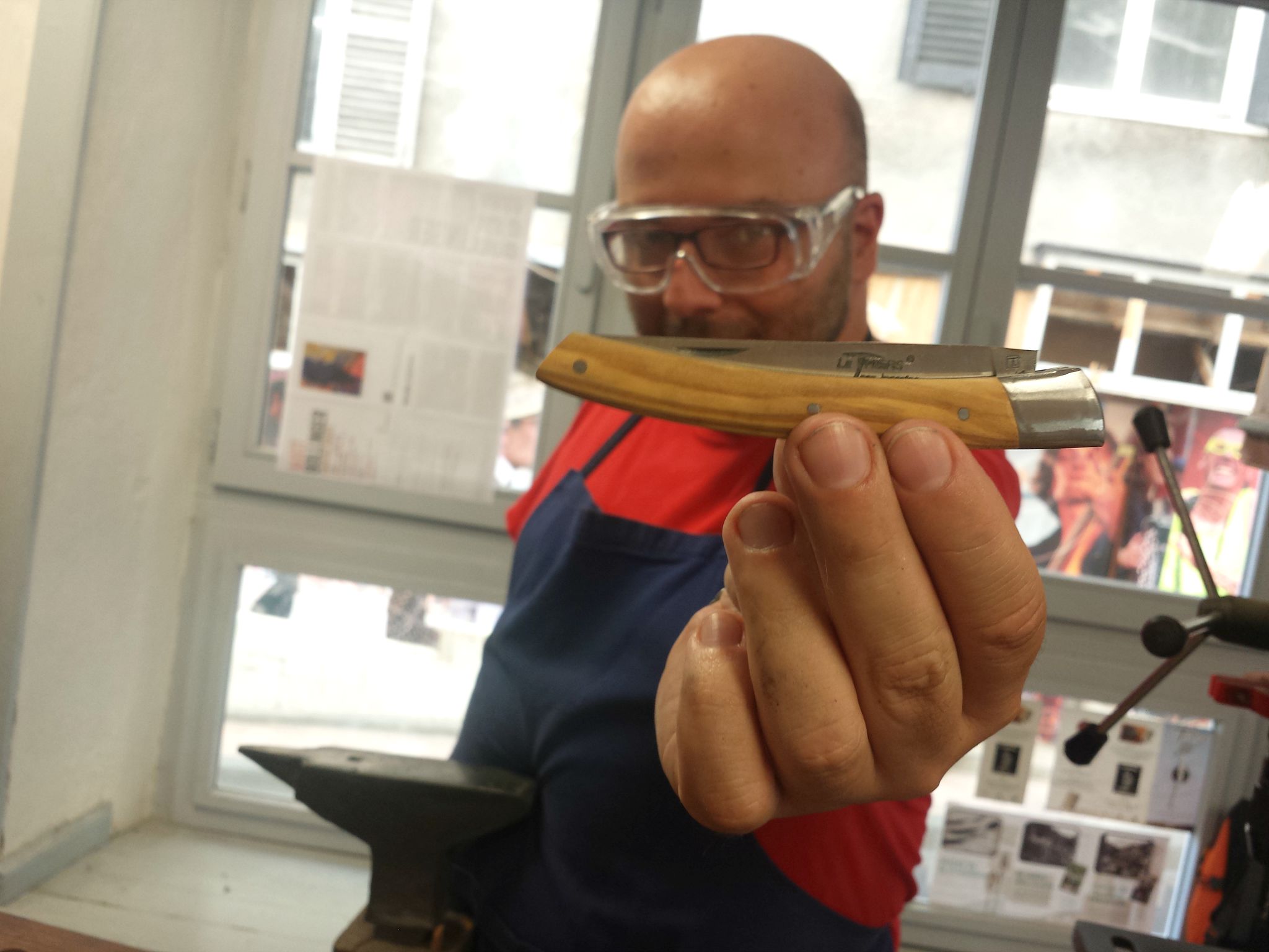Donc voilà, JD a enfilé un beau tablier bleu et une paire de lunettes de protection. Il a été mis en binôme avec le frère de ma collègue Irène, sur laquelle nous sommes tombés tout à fait par hasard ce jour-là et qui elle aussi avait offert cet atelier, et les deux compères ont été confiés aux bons soins de Marine, une jeune animatrice qui leur a montré tout ce qu’il fallait faire pour confectionner un joli couteau de Thiers. Je vous passe les étapes, à base de coups de marteau, de lime et de polissage. Au bout d’une heure et demie de concentration et de gestes minutieux, c’est un superbe couteau au manche en bois d’olivier qui est remis aux participants, qui peuvent, s’ils le souhaitent, faire graver avec leur prénom. Cerise sur le gâteau, un petit étui de tissu est également remis avec le couteau. Cet étui est réalisé par un autre atelier d’insertion, l’Atelier au Fil du Temps, qui possède également une boutique à Thiers.