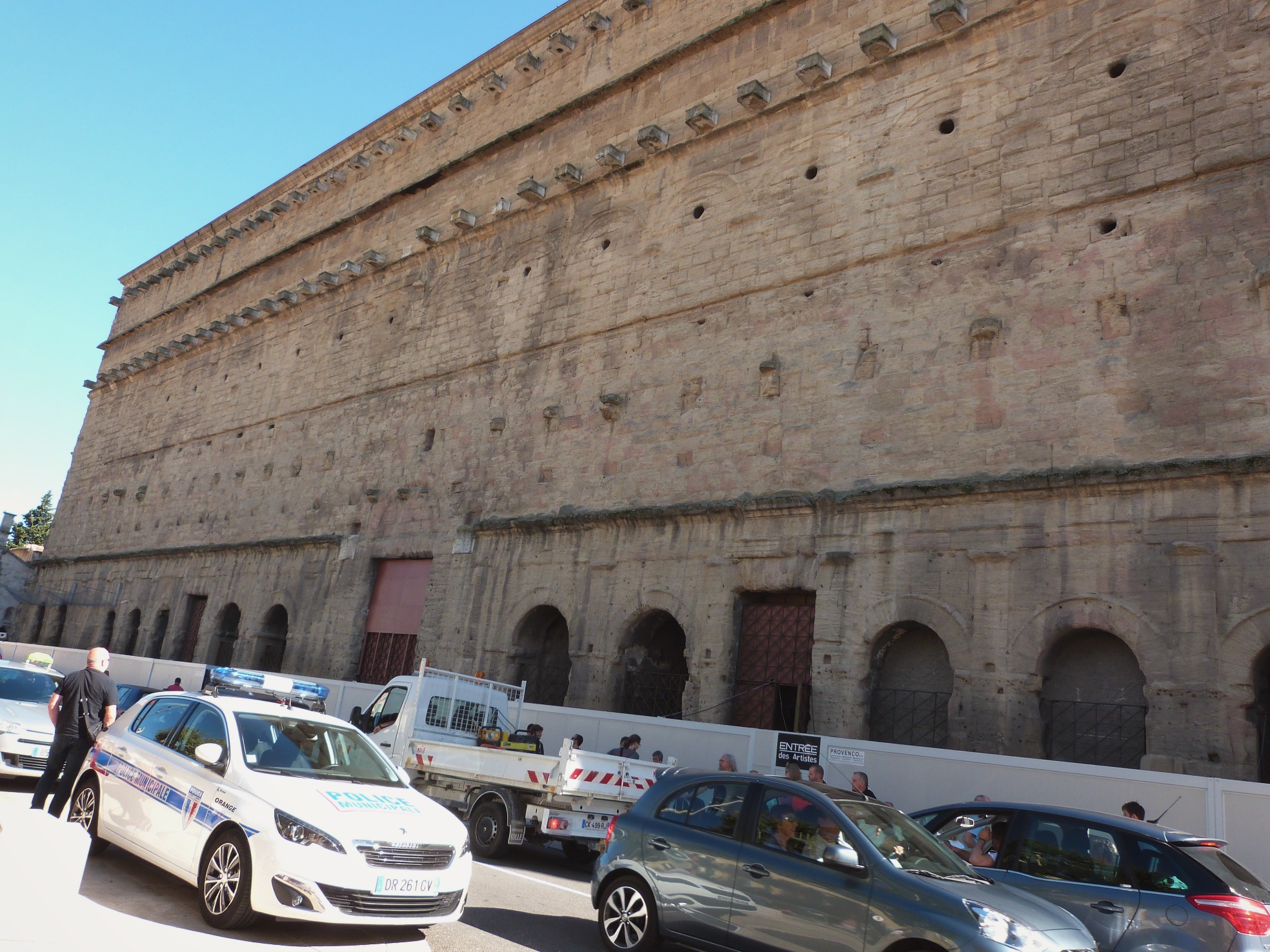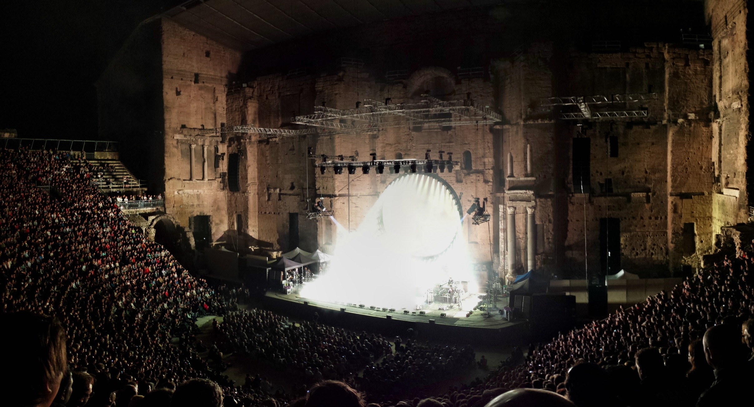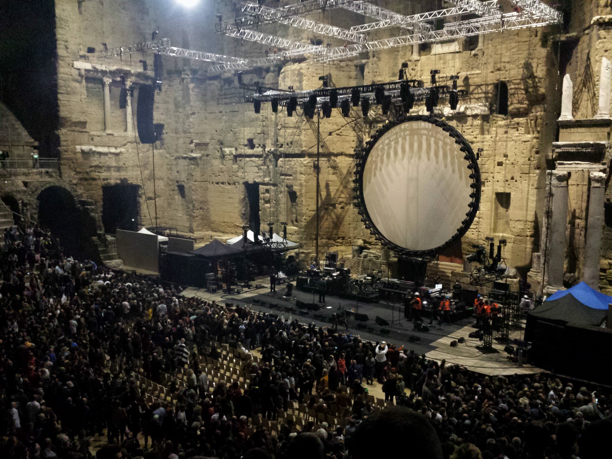 Après une belle journée de balade dans cette ville charmante, nous nous sommes postés dans l’une des deux files d’attente qui s’étiraient le long du mur du théâtre antique. Difficile de savoir si nous étions bien positionnés… la réponse est arrivée comme un couperet après plusieurs dizaines de minutes au moment de franchir l’entrée : non. Placés comme on était, fallait prendre l’autre file. Holy shit ! Se repositionner au même endroit que lorsque nous sommes arrivés la première fois et… attendre de nouveau. Seule consolation : nous n’étions pas les seuls. Les vases communiquants communiquaient très bien, les recalés de l’entrée 1 croisaient ceux de l’entrée 2 mais sans jamais croiser qui que ce soit du staff pour mettre un peu d’ordre dans ce vaste foutoir. Ça rouspétait ferme dans les rangs, dans toutes les langues, et même dans ceux du staff car j’ai entendu un type badgé pester salement contre l’organisation. Du coup… à 20h, branle-bas de combat, c’est la chenille qui redémarre, les files d’attente se sont magiquement engouffrées dans le théâtre. Ça avait dû fumer en backstage et les vigiles ont laissé entrer les derniers spectateurs sans même jeter un oeil à leurs sacs (ce qui n’est pas à proprement parler très rassurant). Défi numéro 2 : trouver sa place numérotée (t’as vu comme c’est foutu un théâtre antique ?) en se faufilant à travers les genoux déjà installés, tout en contenant sa sensation de vertige intense en voyant cet amphithéâtre plein à craquer. Près de 9 000 personnes ! Ouf ! Les places 82 et 84 ! Faut pas craindre de jouer collé-serré avec ses voisins, l’espace vital est calculé au plus juste.