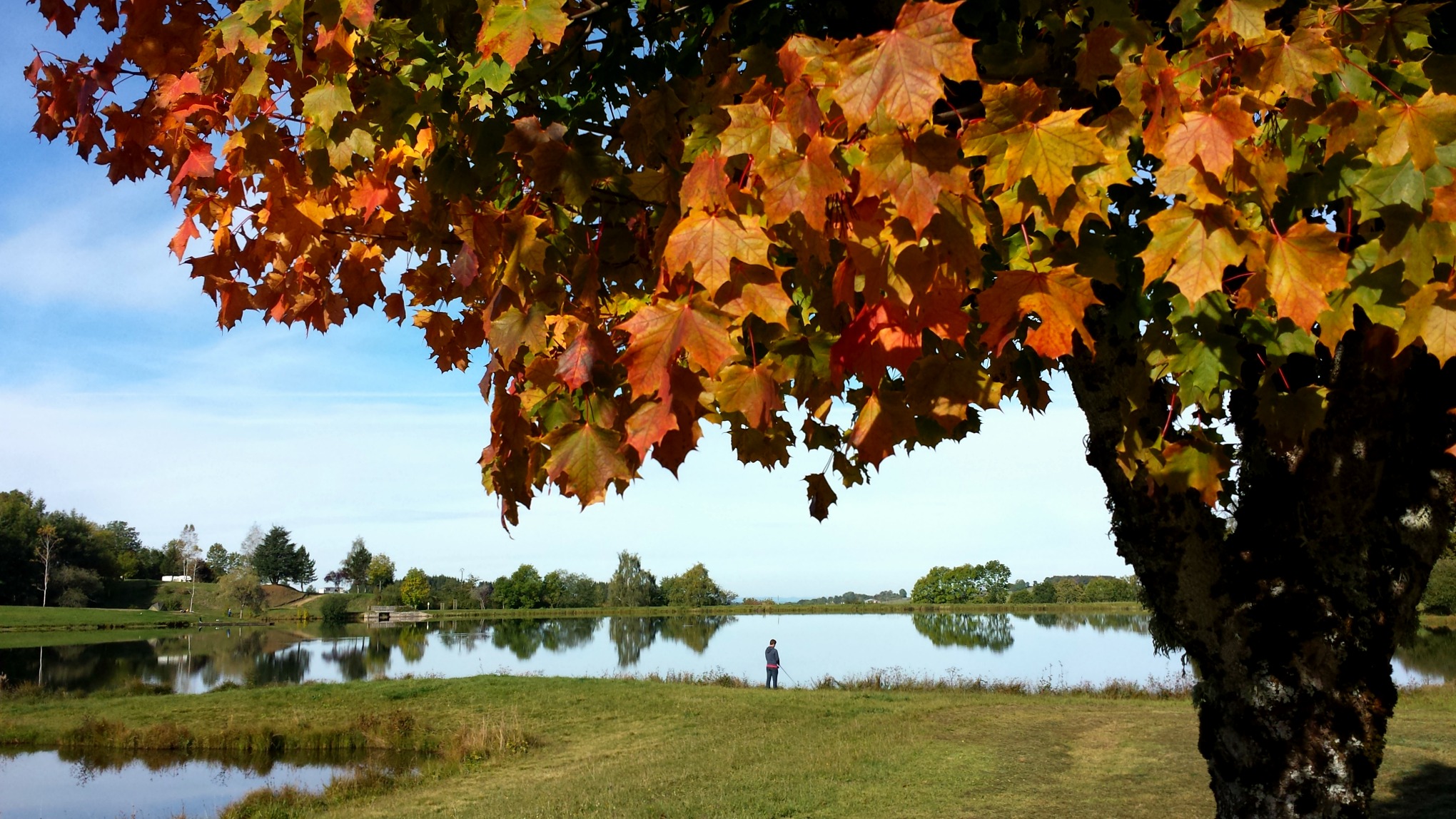 Le départ se fait du plan d’eau. Celui-ci est l’heureux titulaire du précieux Pavillon Bleu, garant d’une très bonne qualité de baignade et d’équipements ad hoc. Fin septembre en début de matinée, personne ne se baigne, bien entendu ! Un pêcheur taquine le poisson en toute tranquillité et les couleurs d’automne sont déjà là.